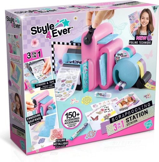 Креативното студио 3 в 1 STYLE 4 EVER е многофункционален художествен комплект за деца от 6 години, който комбинира три любими техники – изработка на стикери, ембосиране и създаване/декориране на уаши ленти. Ръчната машина в пастелни цветове се управлява лесно с помощта на въртящо колелце и позволява да се създават релефни шарки, оригинални стикери и персонализирана украса за тефтери.