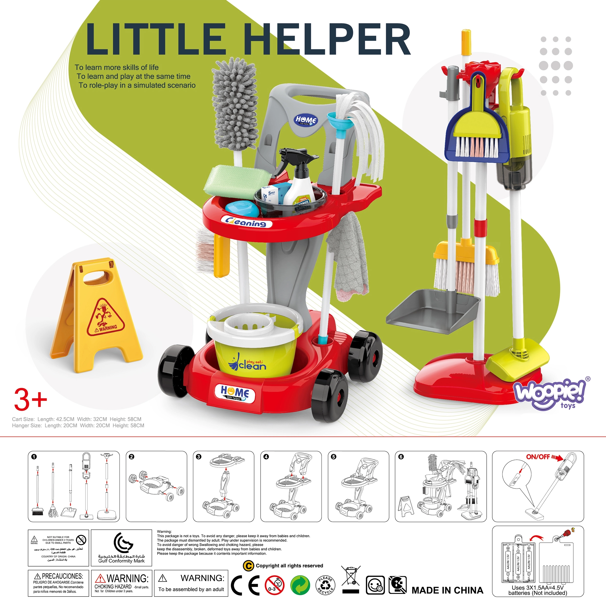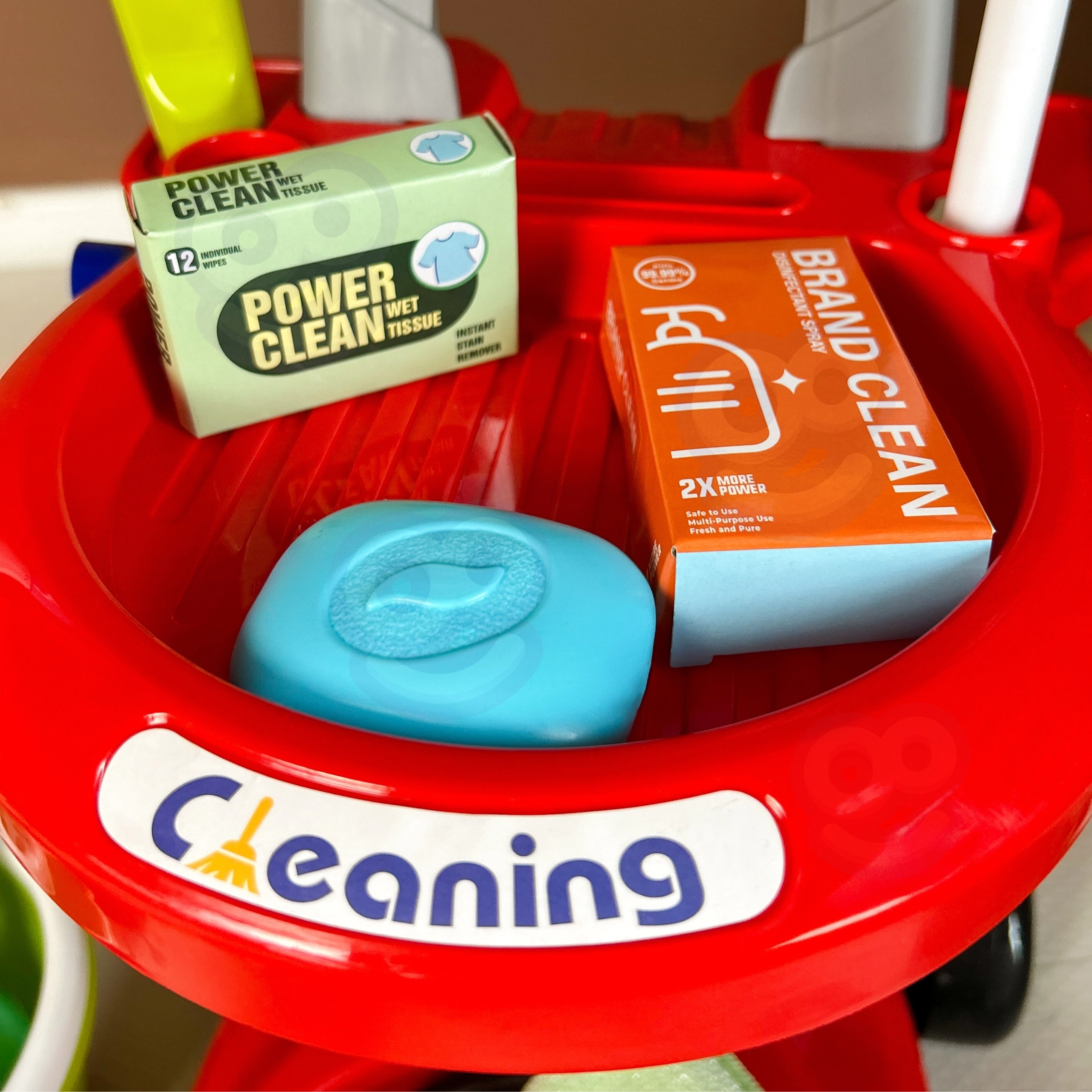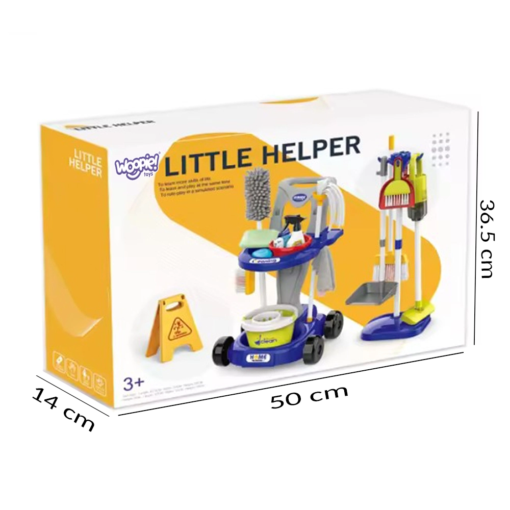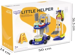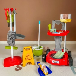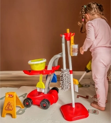 В комплекта има всичко необходимо: количка на колелца, моп, метла и четка със совалка, кофа, пулверизатор, кърпички, предупредителна табела „Внимание, хлъзгав под“ и други аксесоари. Големият брой елементи осигурява на децата часове забавление и подкрепя ролева игра и сътрудничество между братя и сестри.