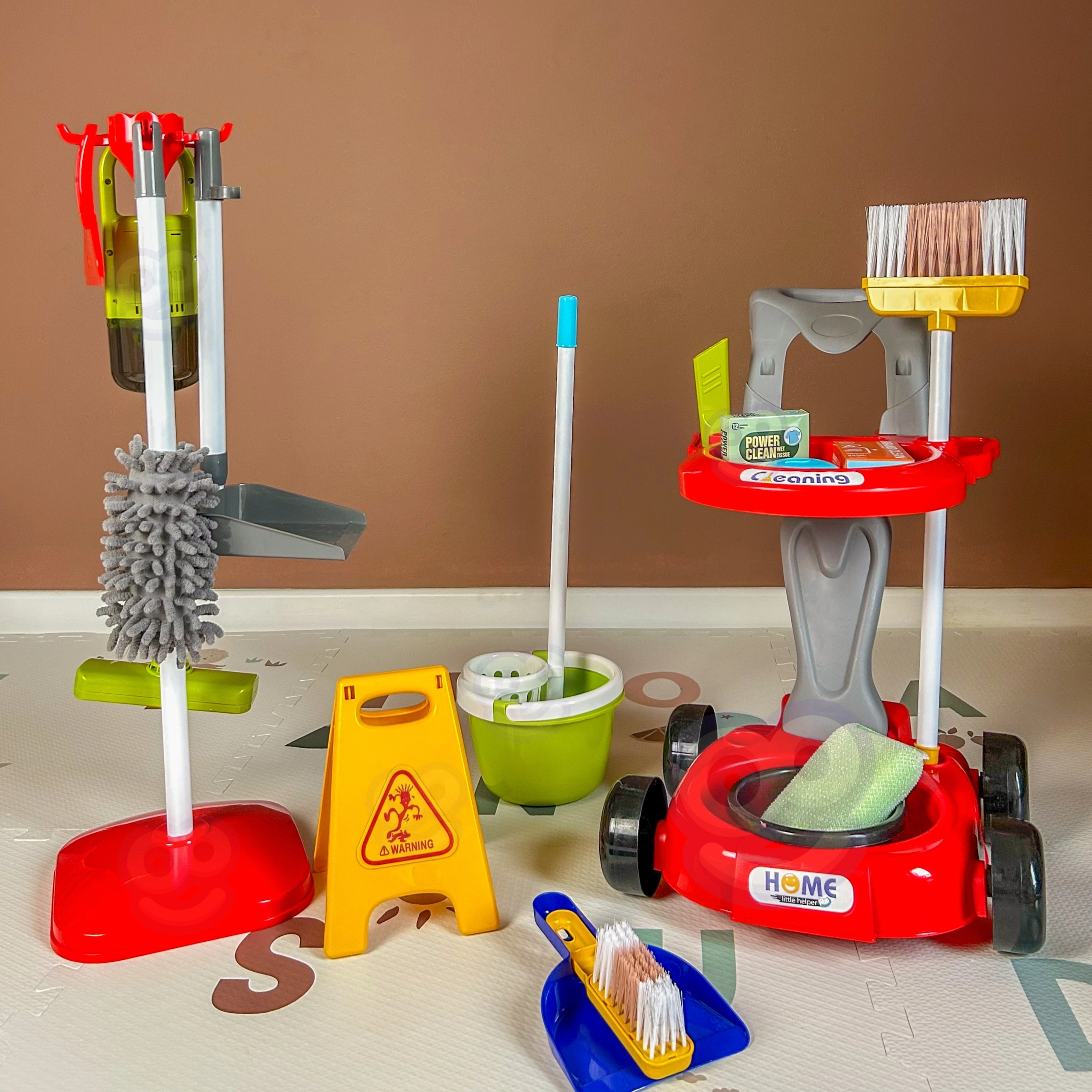 Моп, метла, четка със совалка, кофа, кърпички, пулверизатор и предупредителна табела – всичко, от което малките помощници се нуждаят, за да имитират истинско почистване.