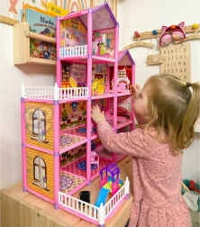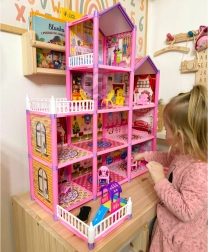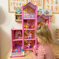 Открийте свят на фантазия с къщата за кукли WOOPIE Lovely House. Тази просторна, многоетажна вила предлага различни помещения, балкони и покриви, които приканват към реалистични сцени от семейния живот. Децата ще се насладят както на сглобяването, така и на последващото обзавеждане на интериора с помощта на детайлни мебели и аксесоари.