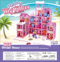 Комплектът съдържа 194 части, включително елементи за DIY монтаж, мебели, декорации и фигурки. Къщата е изработена от безопасни, издръжливи и цветни материали, за да е подходяща за деца от 3 години и да издържа на дълги часове игра.
