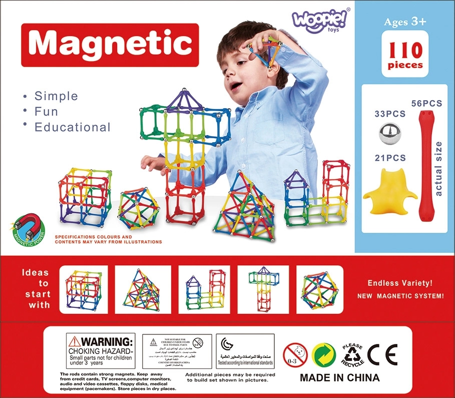 Представяме уникалния магнитен конструктор от Woopie, идеален за деца от 3 години. Този сет съдържа до 110 части, включително метални топчета и пластмасови пръчки, които могат да се свързват в различни форми и структури. Креативните възможности на този конструктор са почти неограничени, което позволява на децата да създават геометрични фигури, букви, а дори и математически задачи.
