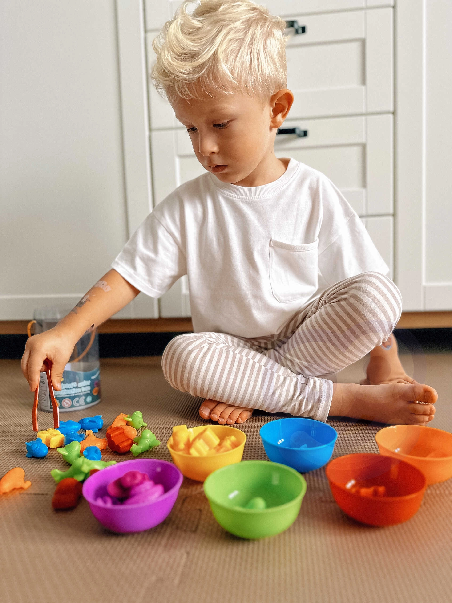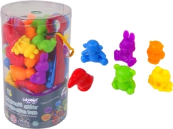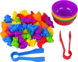 Този цветен Монтесори комплект предлага прост, но много ефективен начин на обучение. Децата изсипват фигурките на масата и с помощта на щипките ги разпределят в купичките по цвят, с което развиват координация око–ръка, концентрация и логическо мислене. Гумените фигурки са приятни на допир и безопасни за малките детски ръце.