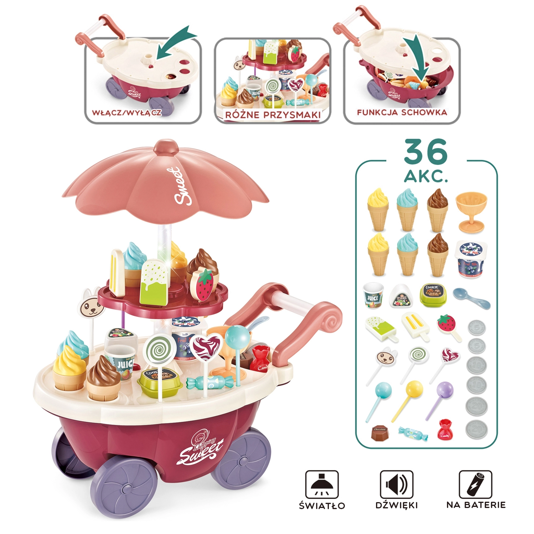 Съдържа множество аксесоари като сладоледи, близалки, монети и други, позволяващи реалистична игра.