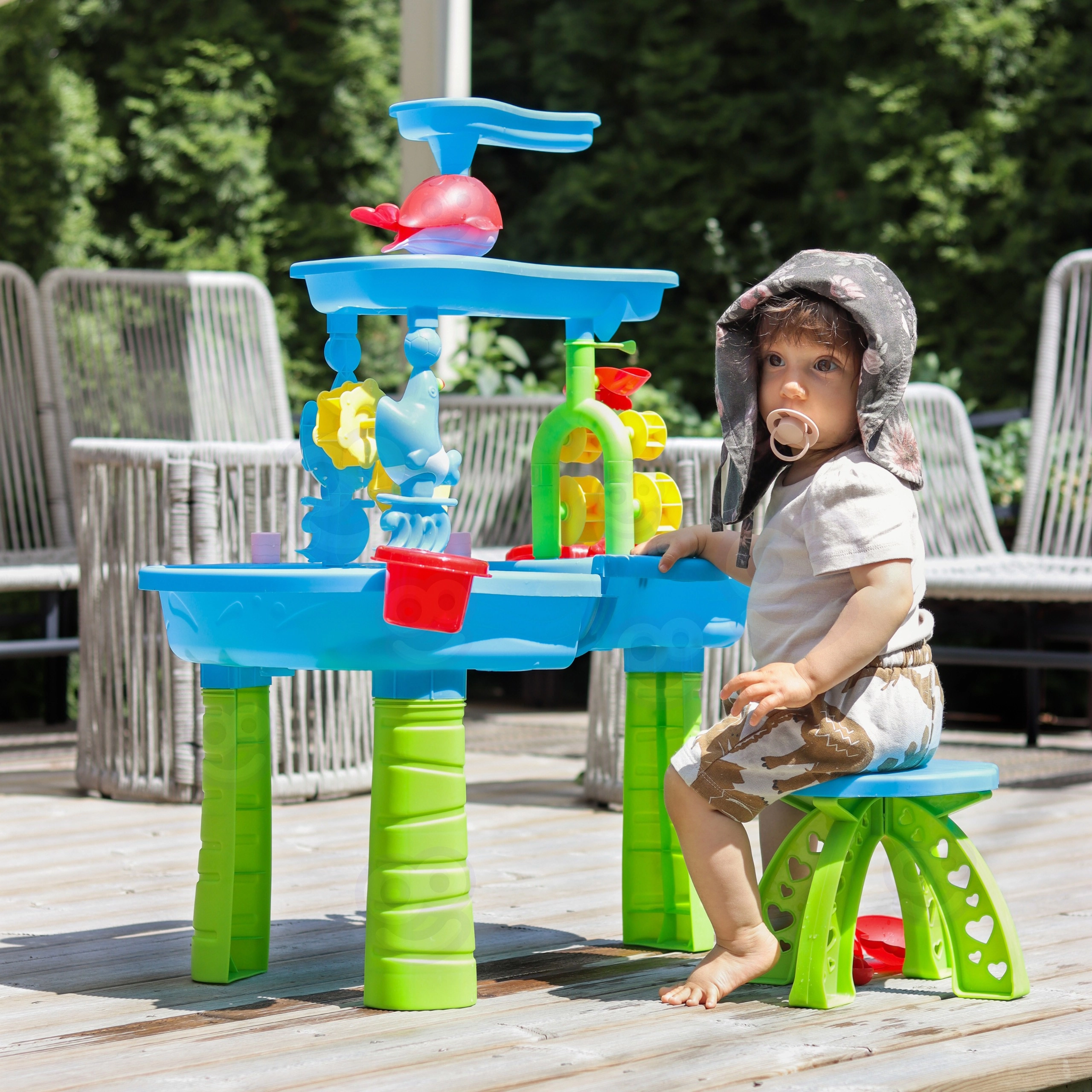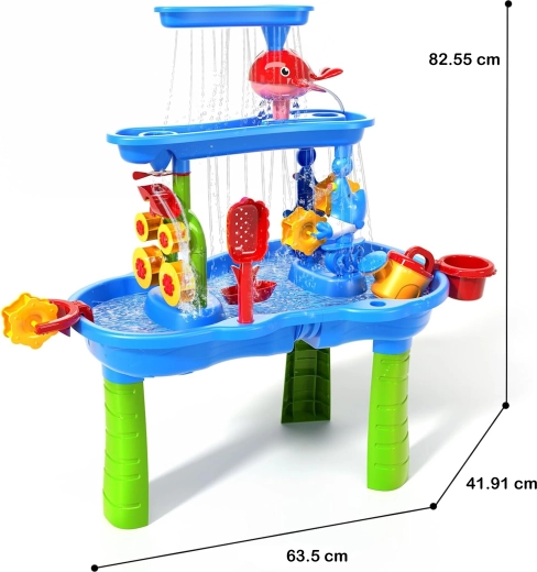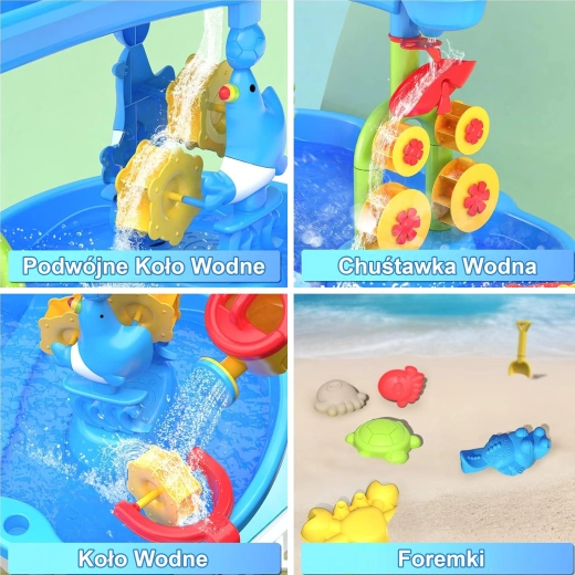 Водната и пясъчна масичка WOOPIE XL носи целогодишно забавление – през лятото освежаващи водни атракции, а в по-хладните месеци творчество с пясък или кинетичен пясък. Благодарение на тристепенната каскадна система децата наливат вода в горния резервоар и наблюдават как потокът завърта водните колела и мелничките и се стича в долните ванички. В комплекта са включени и столче, и широка гама инструменти за игра и експерименти.