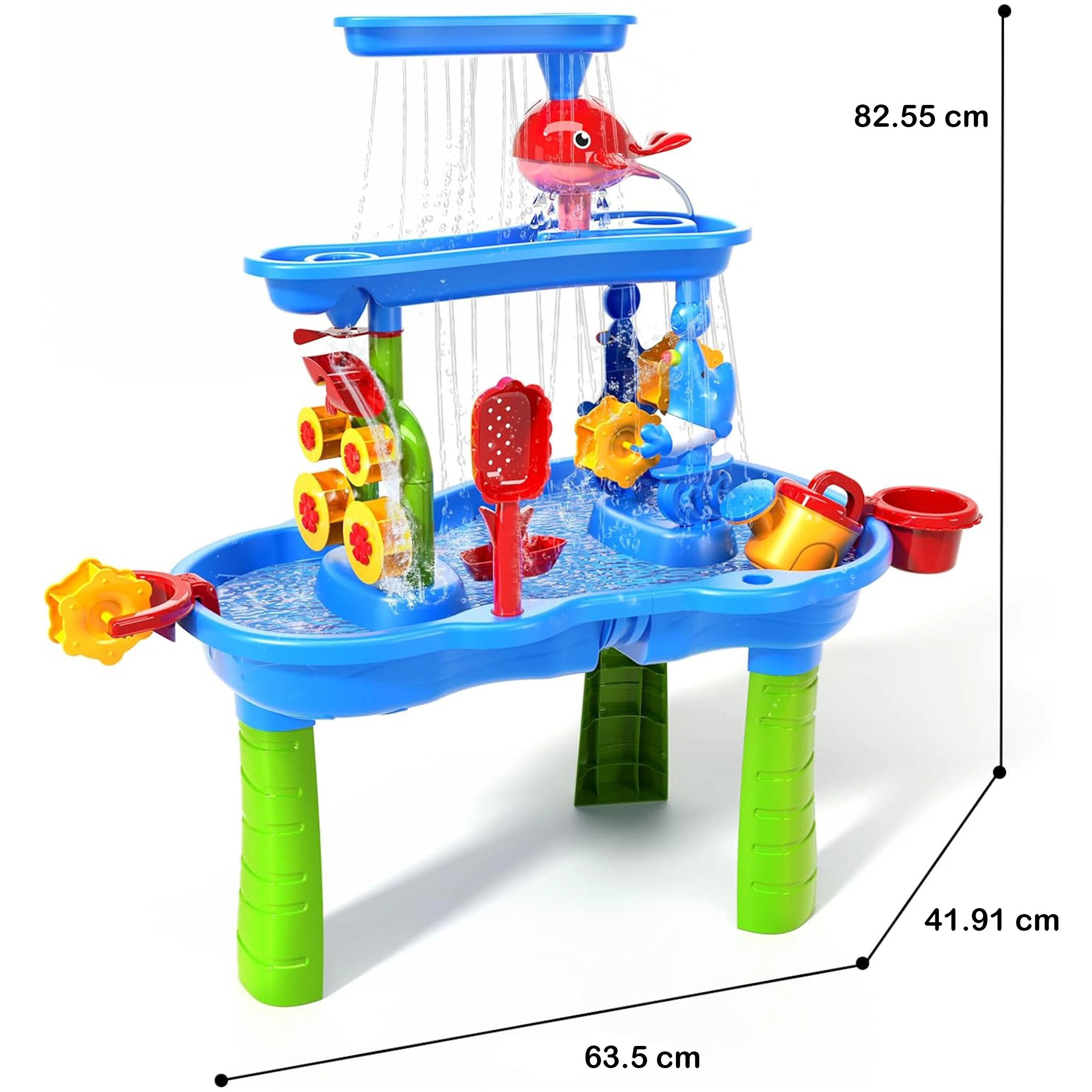 Налей във горния резервоар и наблюдавай как водата тече по улейчетата, завърта колелата и увлича децата в откриване на причинно-следствени връзки.