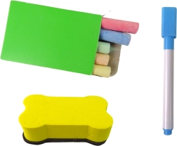 - Пълен комплект аксесоари: магнитен маркер с гума, 5 цвята тебешир, гъба
