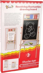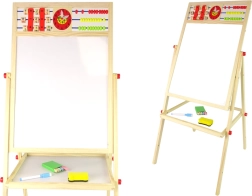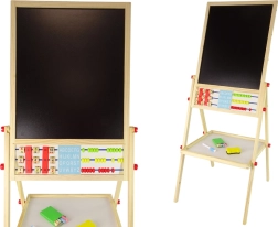Универсална дървена дъска за деца от 3 години, която комбинира магнитна бяла повърхност и класическа тебеширена дъска. Стабилна конструкция с практичен рафт за принадлежности, включени са магнитен маркер с гума, цветни тебешири и гъба. Страхотен помощник за учене на букви, смятане и креативно рисуване.