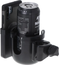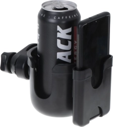 Тази стойка е подходяща за различни видове бутилки, бидони, термоси и телефони. Четирите еластични „уши“ осигуряват сигурна фиксация на напитките без притеснение от разливане. Отворените страни позволяват лесен достъп до съдържанието. Преградата за телефон позволява устройството ви да е винаги пред очите, за да не пропускате важни съобщения.