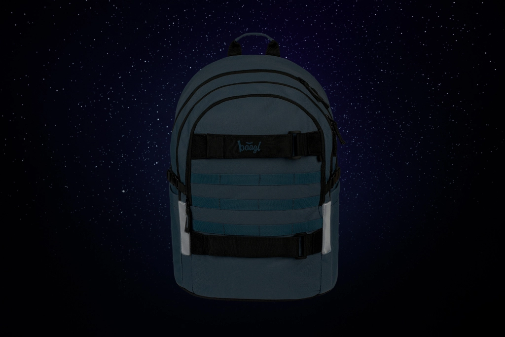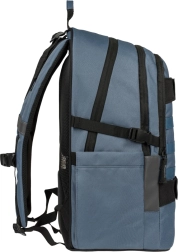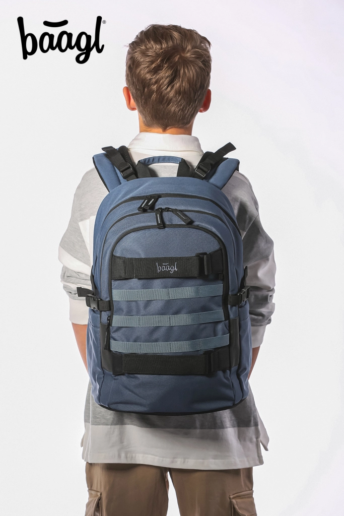 Ученическа раница Skate Dust Blue: Лек модел с тегло под 900 g, регулируеми ремъци за скейтборд и анатомично оформени гръбни подплънки. Раницата разполага с три отделни отделения, подплатен джоб за лаптоп или таблет до 15 инча, светлоотразителни елементи и надеждни ципове YKK.