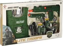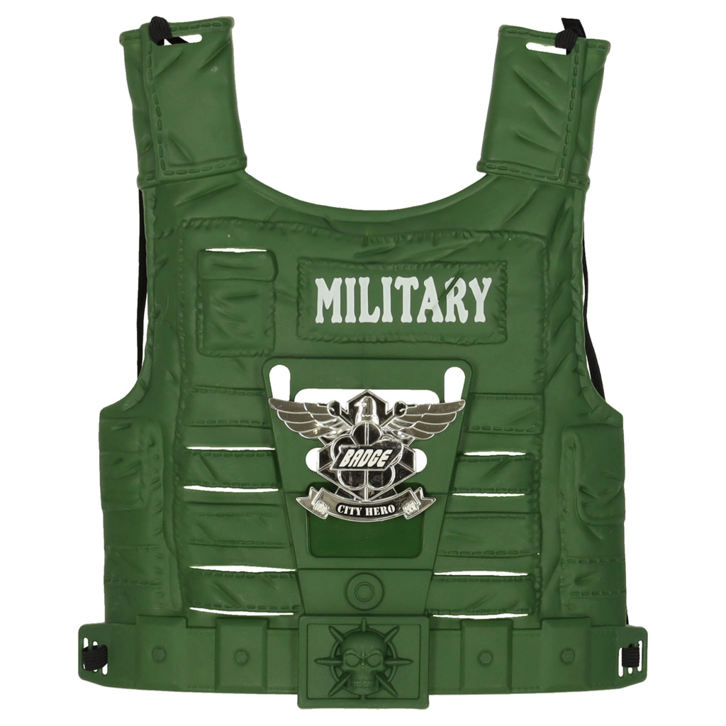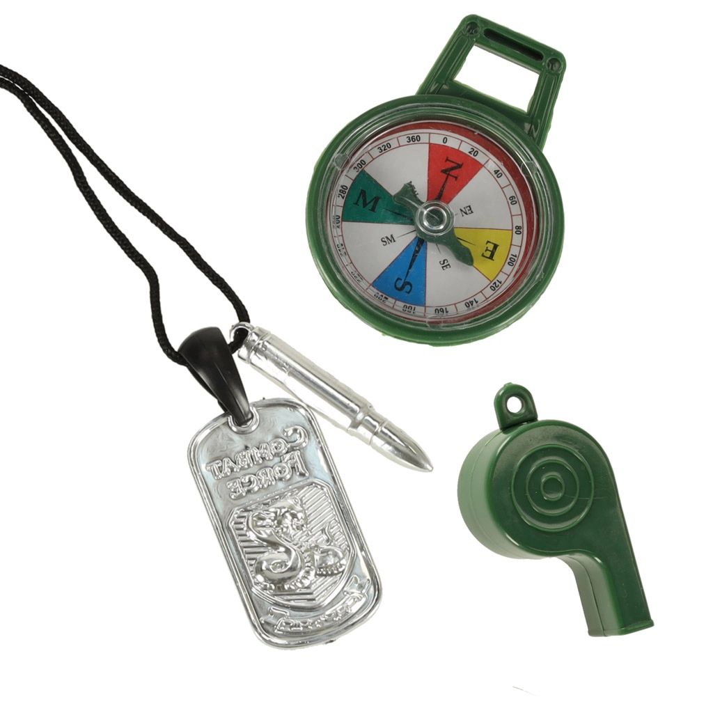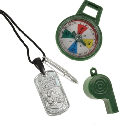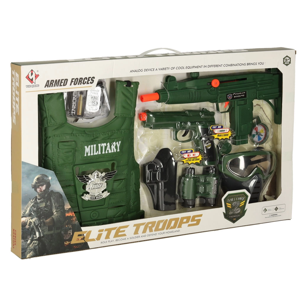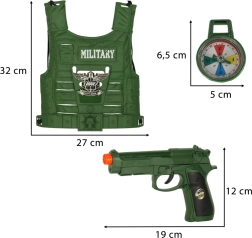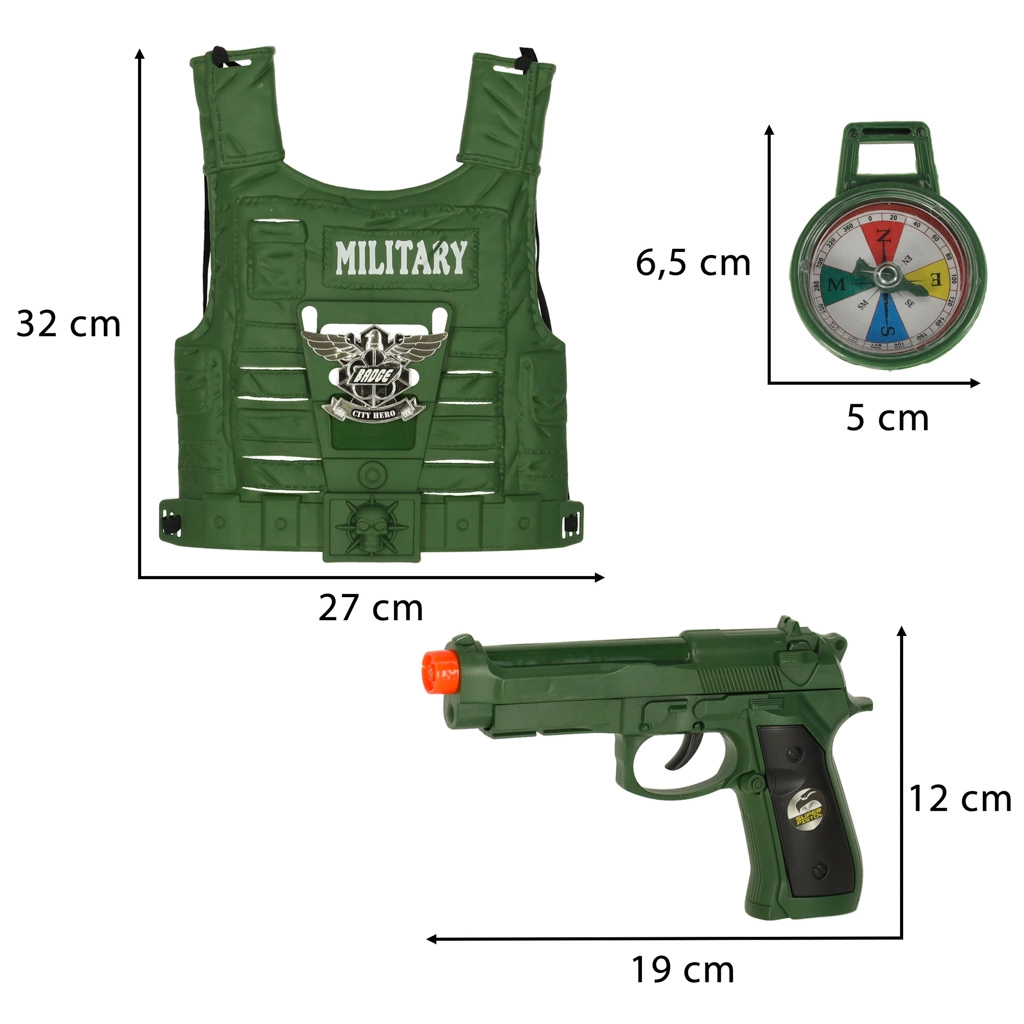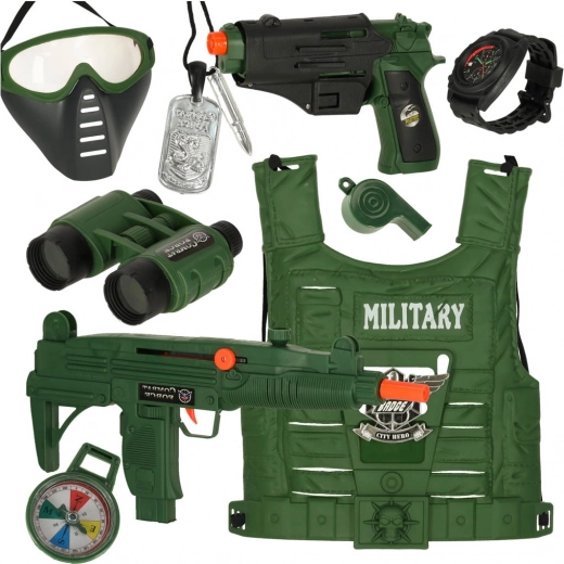 Този военен комплект е идеален за всички малки любители на приключенията и военните игри. С него децата могат да преживеят вълнуващи мисии и приключения. Включва: жилетка, бинокъл, пушка с механично презареждане, пистолет на батерии, силиконов часовник, маска за очи, компас, истинска свирка, военна идентификационна плочка и кобур за пистолет. Всеки елемент е изработен от качествени материали и предлага реалистични детайли.