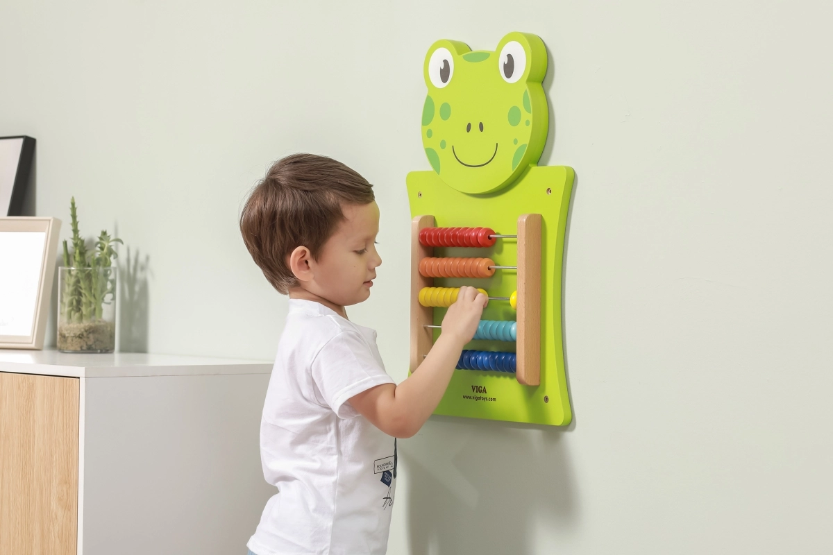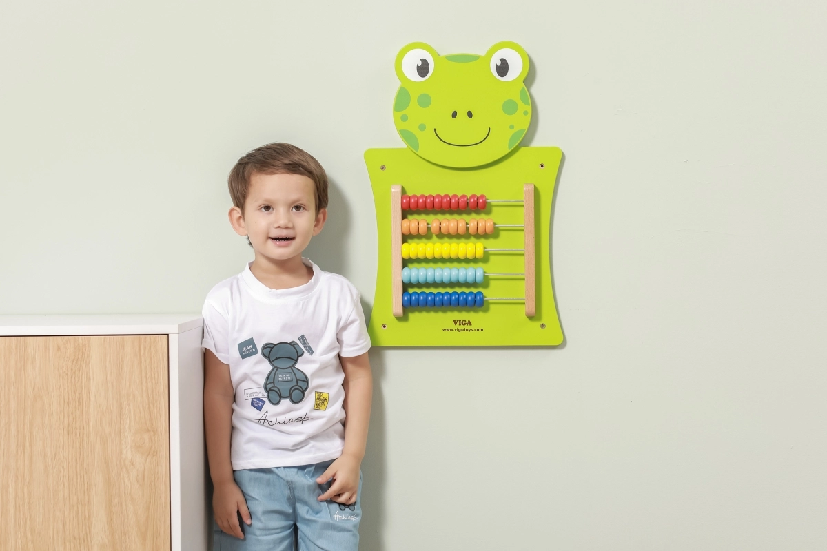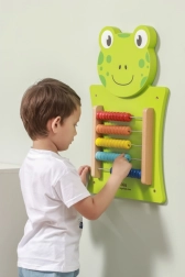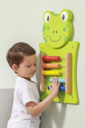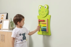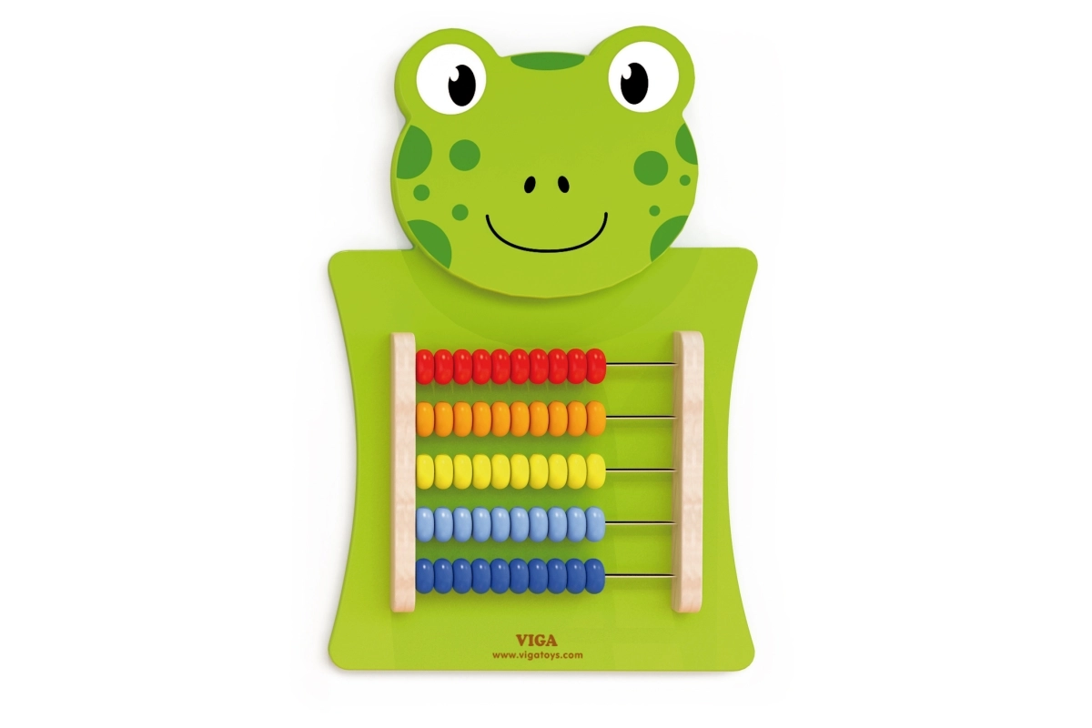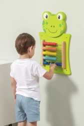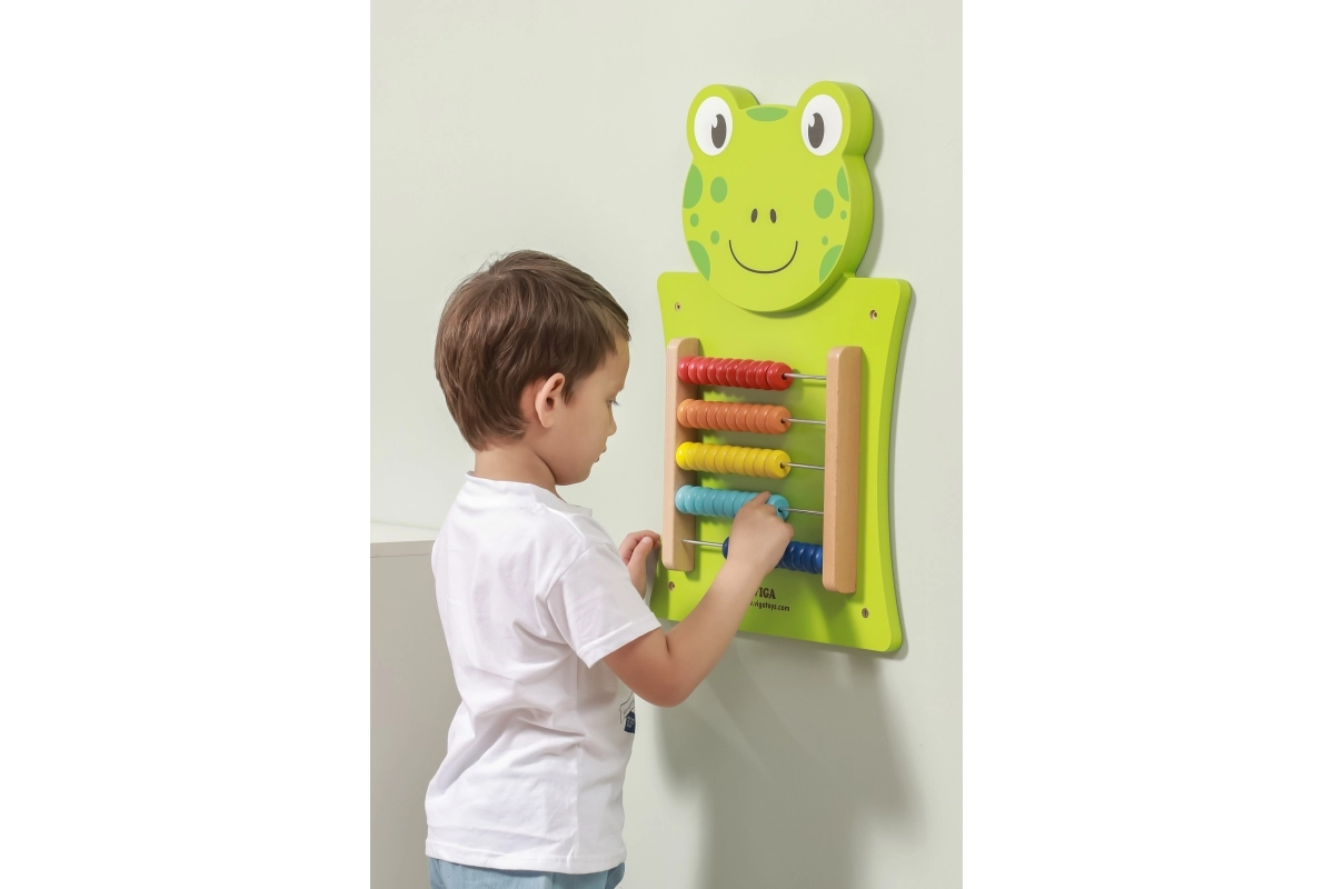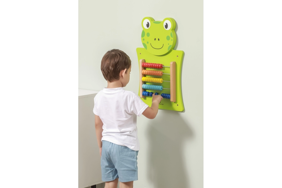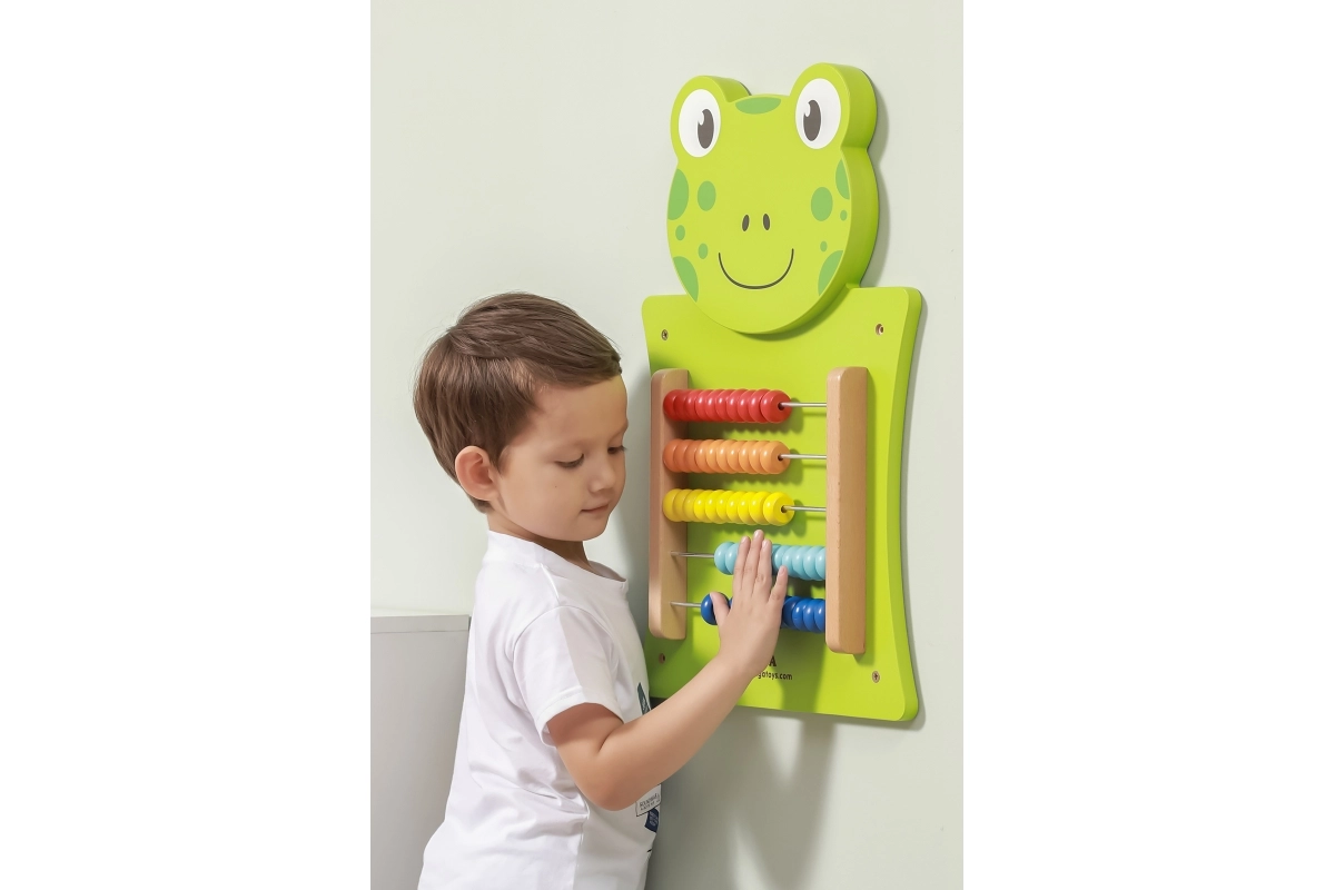 Това жабешко сметало съчетава игривата естетика с практичното учене. Пет хоризонтални пръчки с цветни мъниста подтикват децата да ги преместват и броят, с което тренират фината моторика, координацията око–ръка и логическото мислене. Стенното изпълнение пести място и е винаги под ръка.
