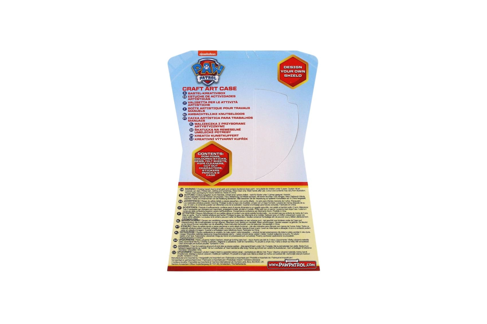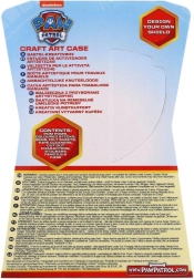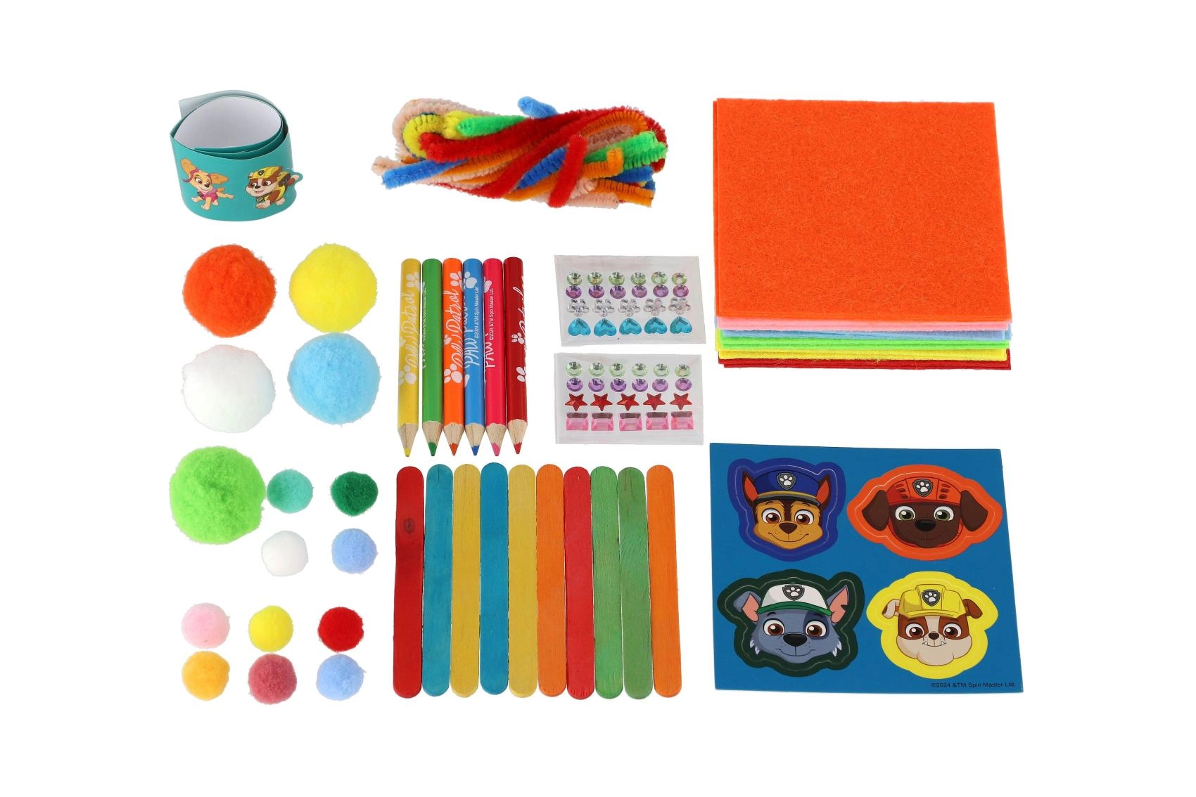 Вътре ще намерите пъстър микс от пособия за колажиране, лепене и рисуване: меки помпони, пухкави шенилни телчета (chenille), пяна или филцови форми, дървени пръчици, пастели и стикери с любимите кучешки герои. Включени са също карти и активности като „създай собствен щит“, които развиват креативността и уменията.