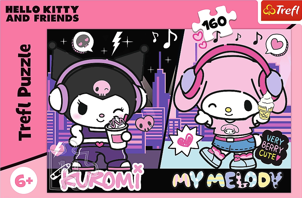 Забавен пъзел с мотиви на KUROMI и HELLO KITTY от марката Trefl, съдържа 160 части и след подреждане образува картина с размери 410 × 275 мм. Висококачественият, лъскаво каландиран картон осигурява ярки цветове и безопасно подреждане с използване на екологични материали.