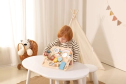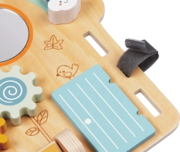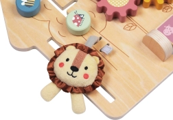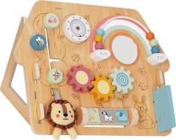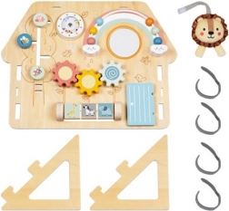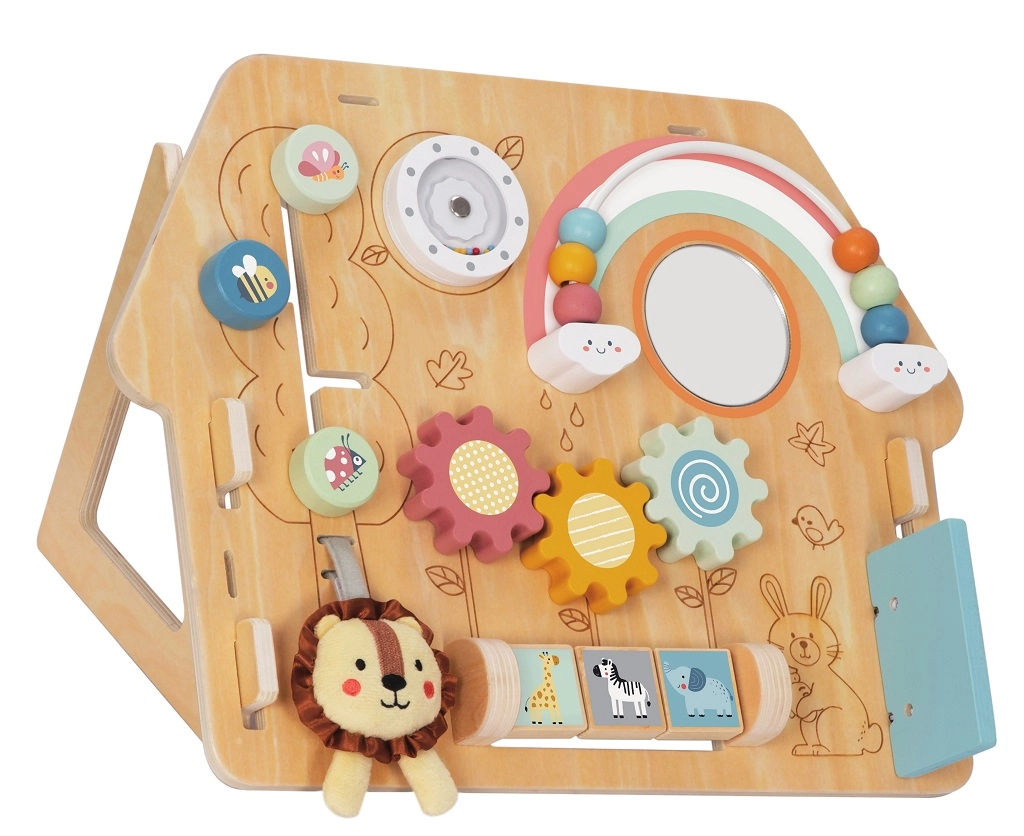 Активна дъска във форма на къщичка с мотив на лъвче стимулира сетивното възприятие на децата благодарение на нежните цветове, сладките картинки и различните текстури на повърхностите. Децата обичат активности като мъниста-лабиринт, въртящи се и плъзгащи се плочки с изображения на животни. Тази игра дъска също подпомага координацията ръка-око и въображението.