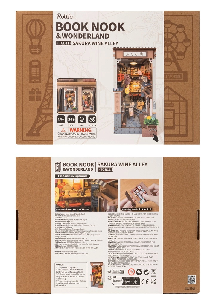 RoboTime 3D пъзел Книгоразделител Сакурова уличка с вино е креативен начин да внесете частица от японската култура във вашия дом. Този пъзел съдържа 249 прецизно изрязани части, които лесно се сглобяват, образуват стабилна конструкция и не изискват лепило или инструменти.