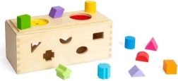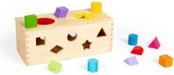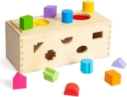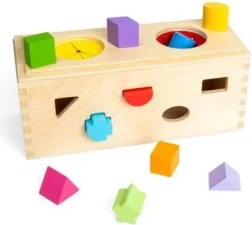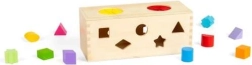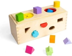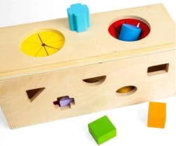 Обогатете сетивния опит на вашите деца с тази дървена мистериозна кутия. Поставете 10-те форми в съответните отвори по стените на кутията. Чрез двата отвора в горната част децата могат да вкарат ръце, да опипват и разпознават формите вътре в кутията, което подобрява фини моторни умения и координация ръка-око.