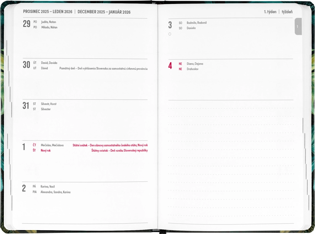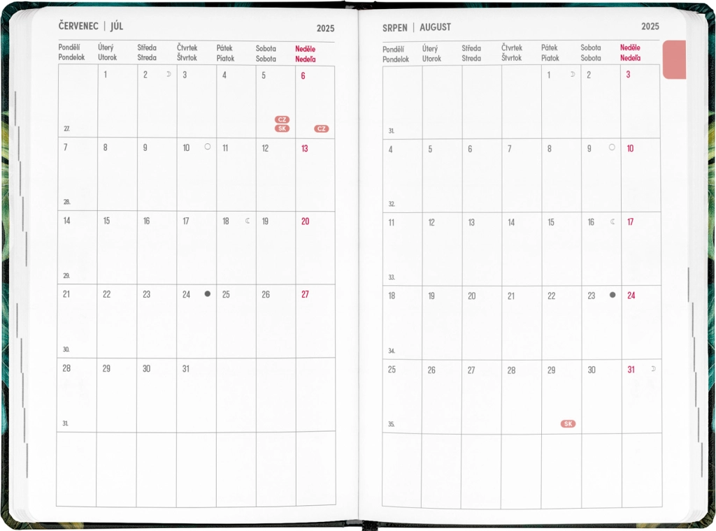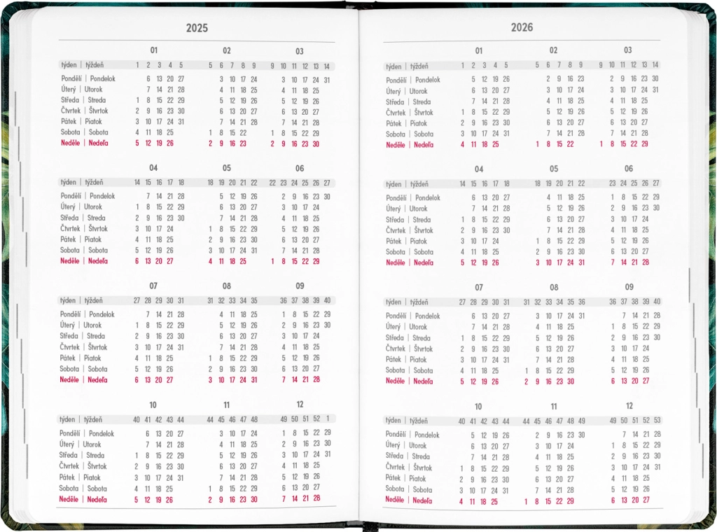 Дневникът Petito Monstera е идеалният помощник за планиране за периода от юли 2025 до декември 2026. Благодарение на прегледа за 2025 и 2026 година и календара с имена и празници не само на чешки, но и на словашки, ще имате всичко важно винаги под ръка. Практичното разпределение позволява лесна ориентация, а мястото за бележки предоставя пространство за записване на важни задачи и мисли. Дневникът има елегантен дизайн с мотив Monstera, който ще зарадва всеки любител на стилни офис принадлежности.