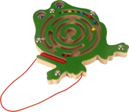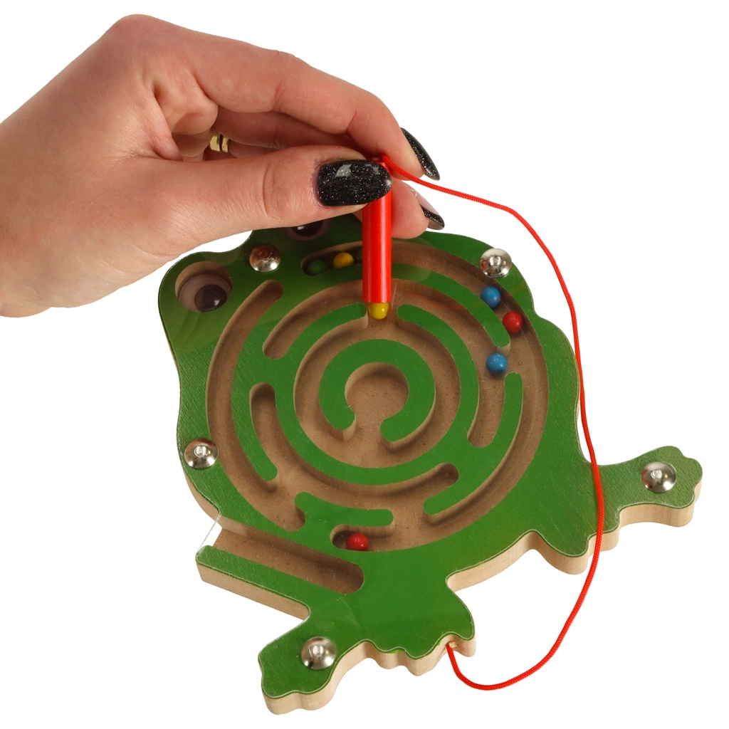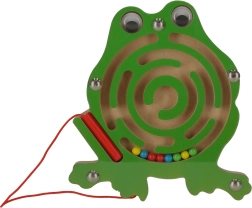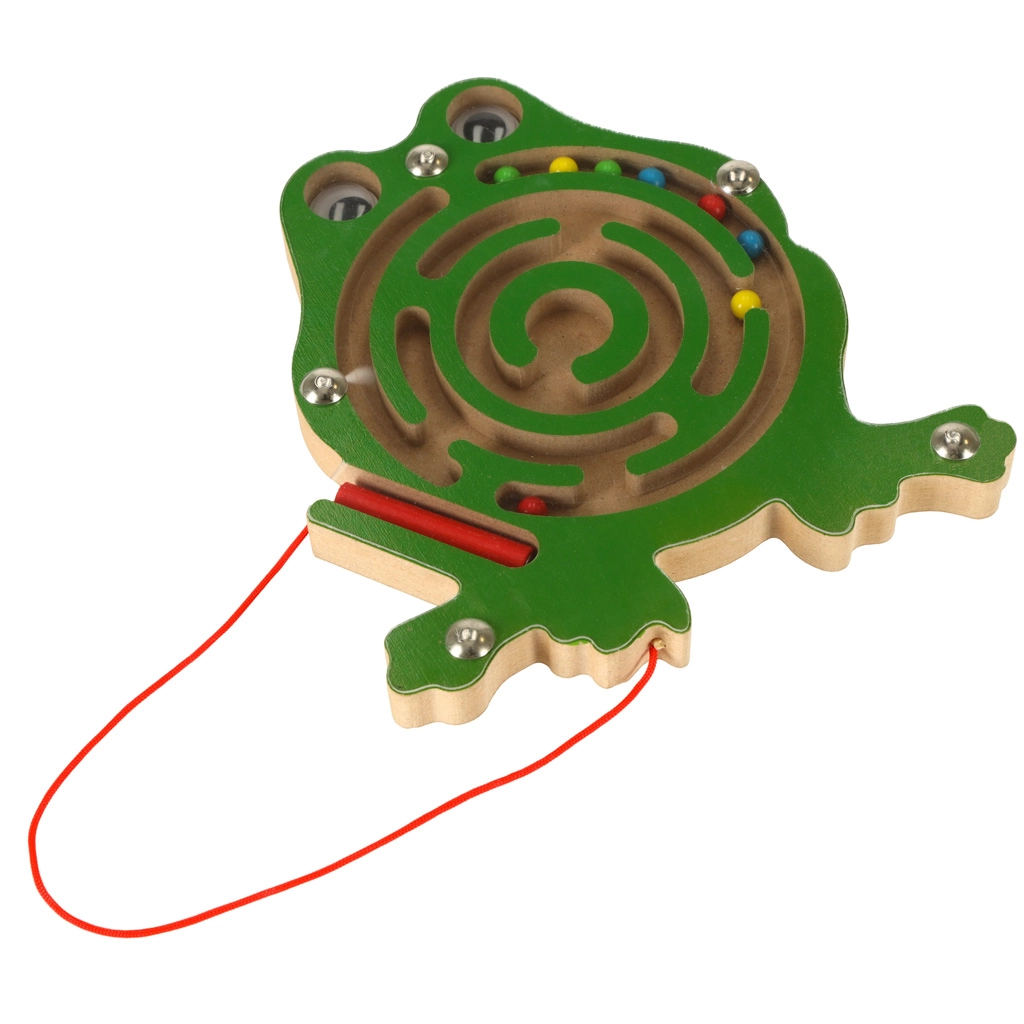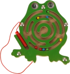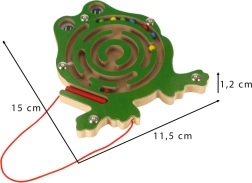 Този дървен магнитен лабиринт във форма на жабка ще забавлява децата дълго както у дома, така и по време на път. Приложената магнитна писалка на връв помага да се водят цветните топчета по заплетените пътеки до целевата точка. Прозрачният капак гарантира, че топчетата винаги остават вътре в играчката.