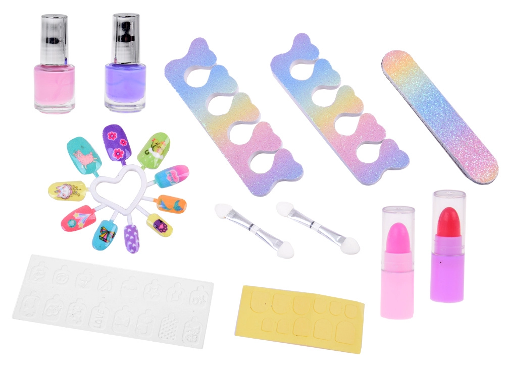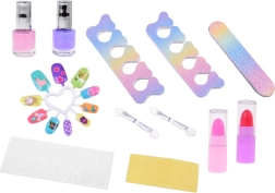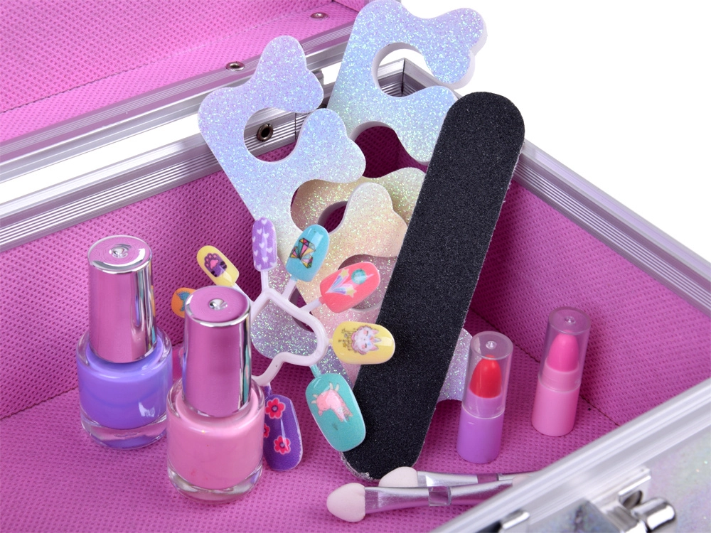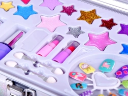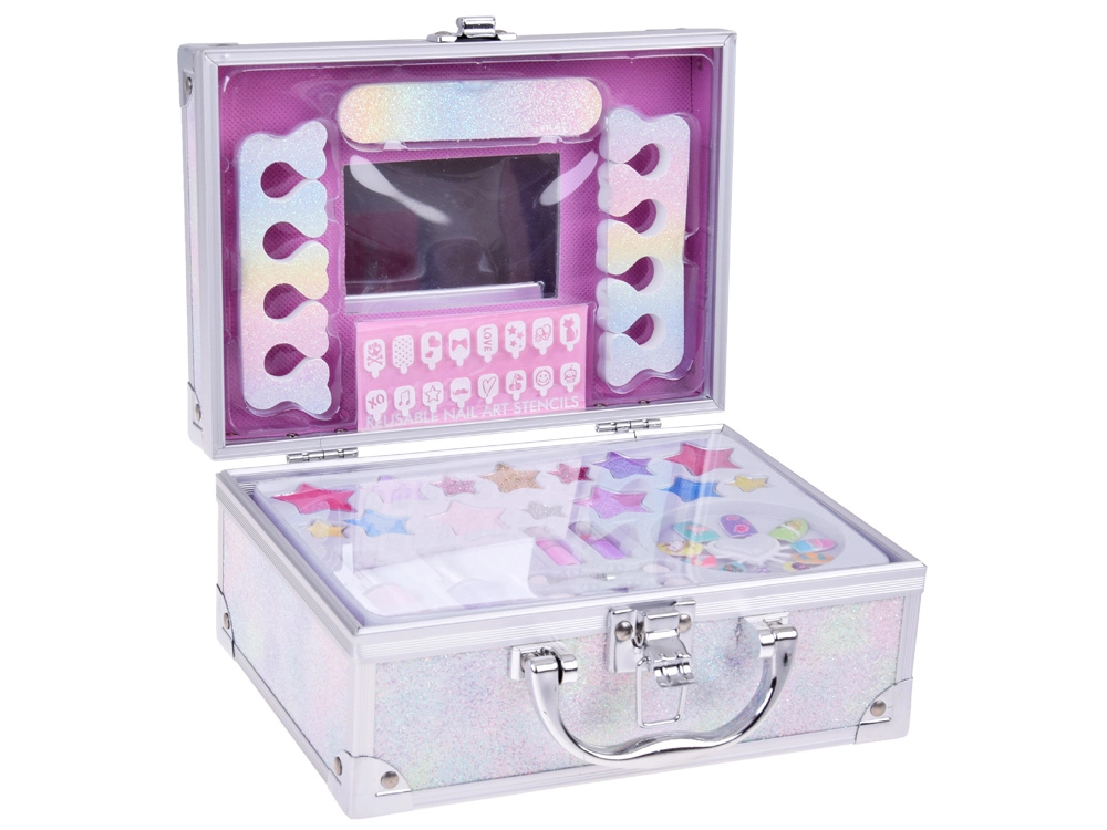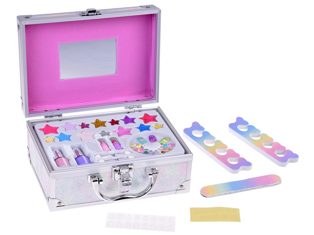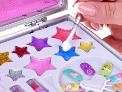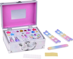 Куфарчето съдържа всичко необходимо за забавно гримиране: лак за нокти, червила, сенки за очи, апликатори, лепящи се нокти и стикери. За по-лесно гримиране вътре има и огледалце.