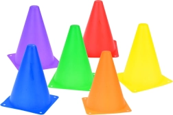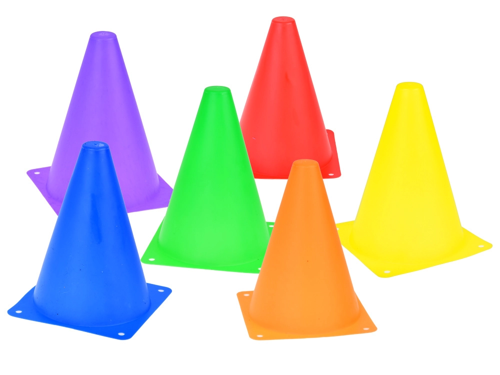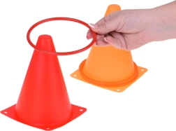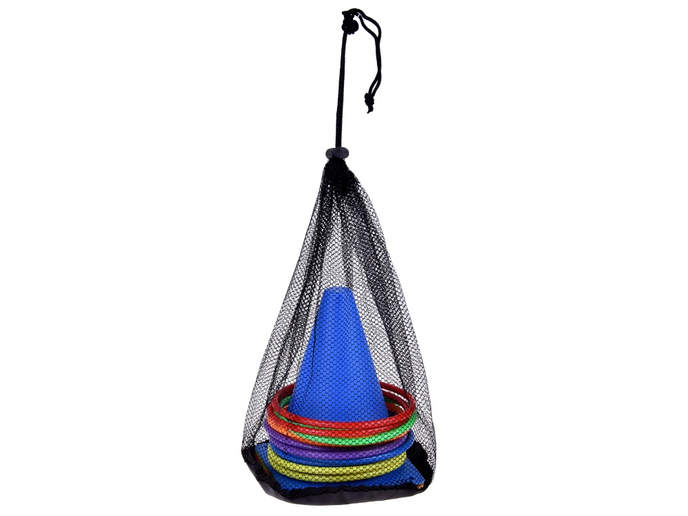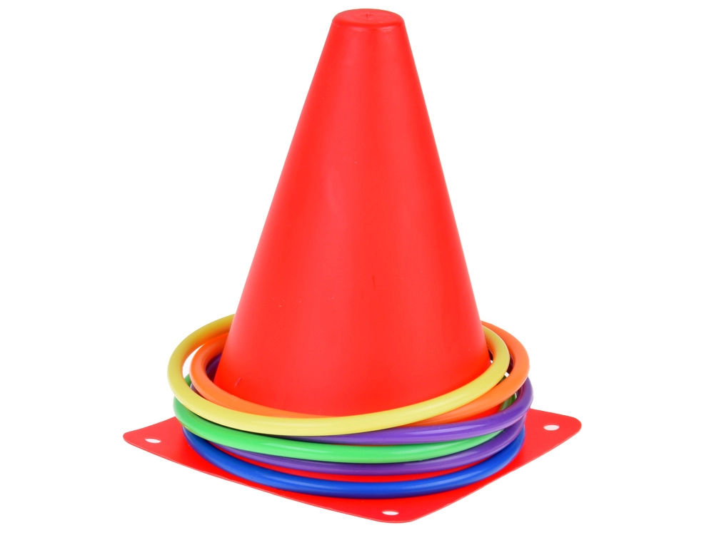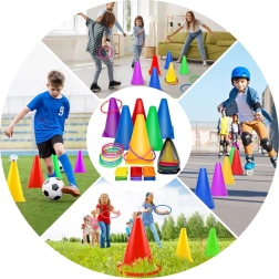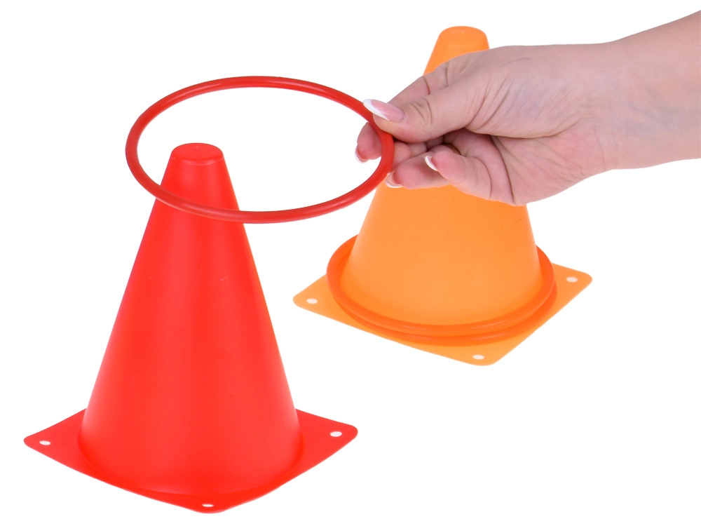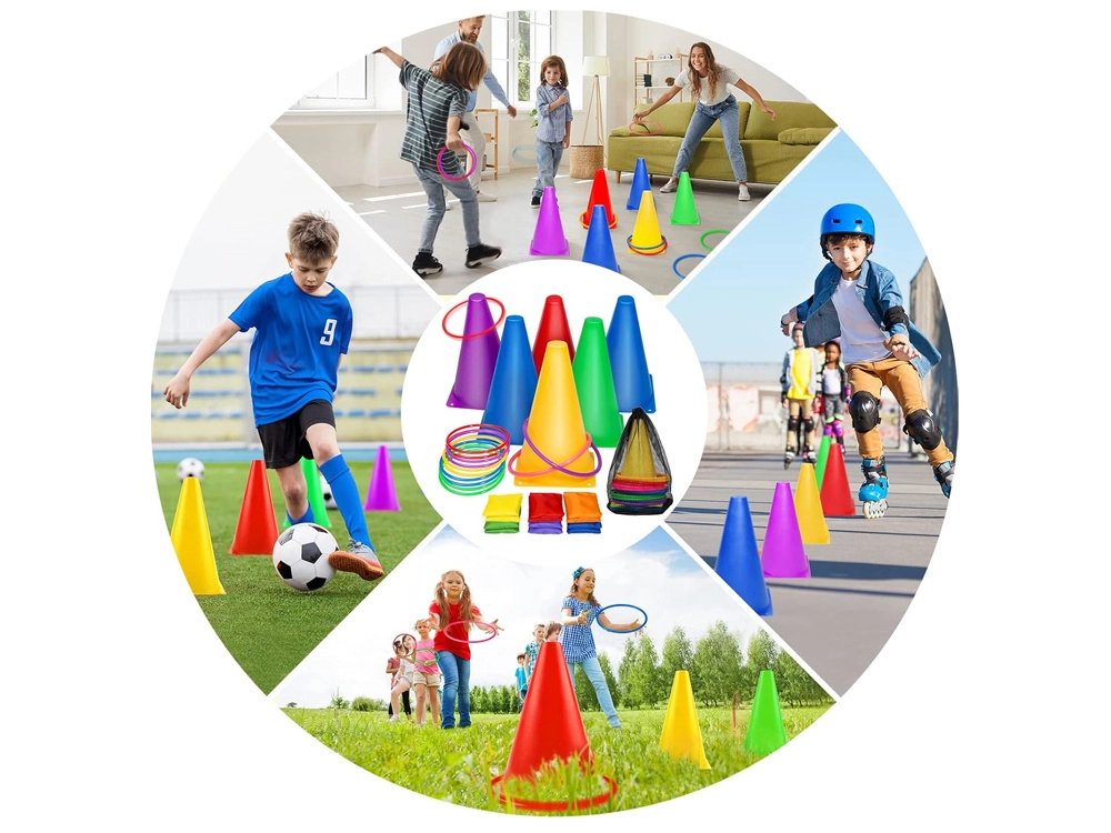 Комплектът съдържа конуси и обръчи в ярки цветове, които привличат вниманието и осигуряват забавление по време на игра. Те са отлични за маркиране на игрища или станции.