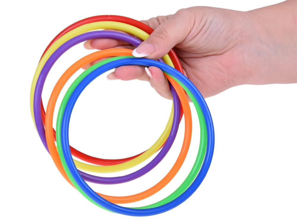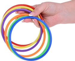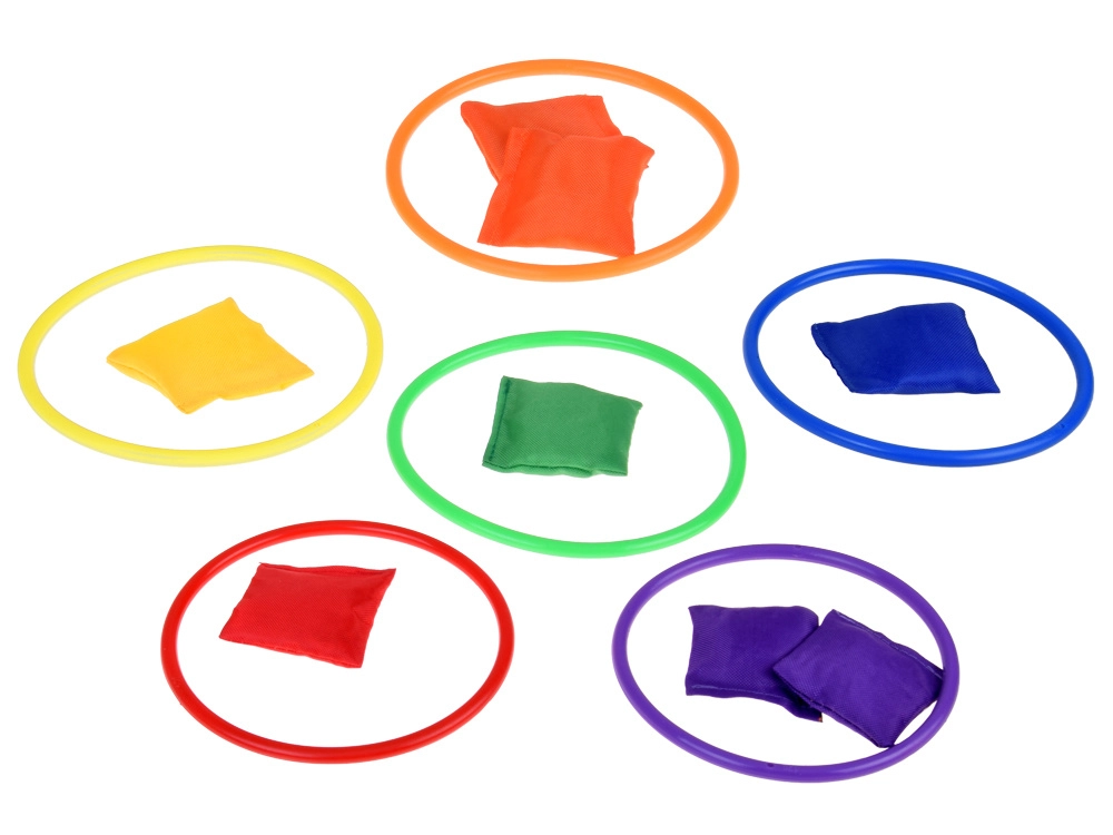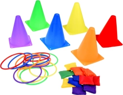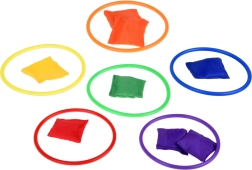 Този игрален комплект е идеален за деца, които обичат да прекарват времето си активно. Съдържа шест цветни конуса, дванадесет текстилни торбички и дванадесет пластмасови обръча, които позволяват различни видове игри. Децата могат да подобрят своята координация и точност при хвърляне и прицелване.