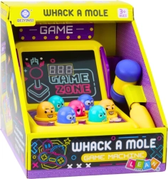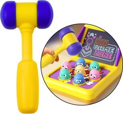 Автоматът е оборудван с дигитален дисплей за проследяване на резултата по време на игра, което добавя елемент на състезание и мотивира децата към по-добри постижения. Играта се захранва с батерии, което позволява включване на весели светлинни и звукови ефекти, повишаващи ангажираността и разнообразието на играта. В комплекта е включен безопасен, лек чук, идеално пригоден за детски ръце, така че играта да е не само вълнуваща, но и напълно безопасна.