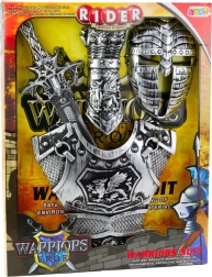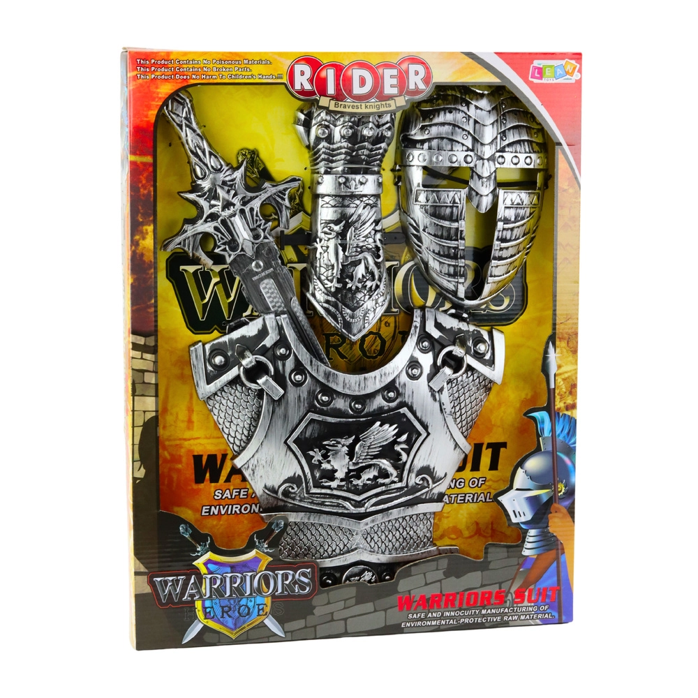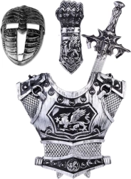 Рицарският комплект съдържа всички необходими елементи за създаване на завършен рицарски образ – от броня, щит и шлем до реалистично изработен меч. Всички компоненти са направени от издръжлива пластмаса, която осигурява безопасно използване дори от най-малките деца.