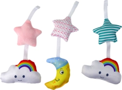Комплектът включва три плюшени висящи играчки – луна, облаче и звезда – проектирани с оглед на безопасността и сензорната стимулация на най-малките. Нежно докосващите фигурки в пастелни цветове помагат за развитие на зрението, допира и двигателната координация на детето. Мобилът насърчава любопитството и осигурява усещане за комфорт при всякакви обстоятелства.