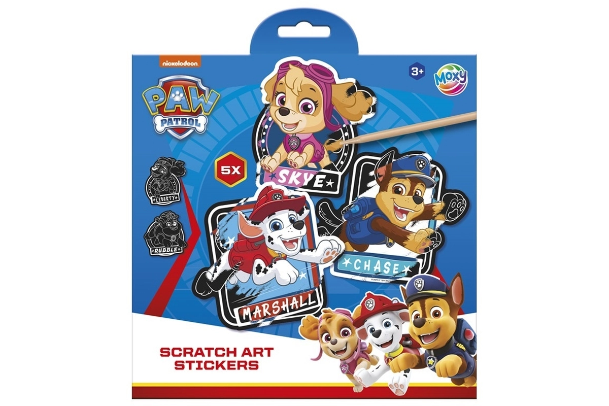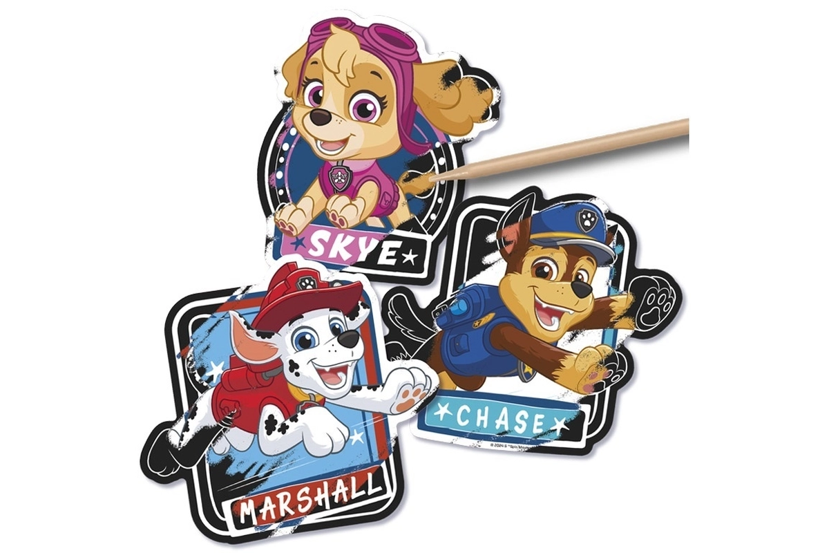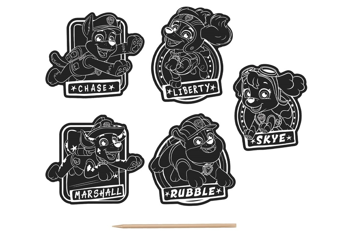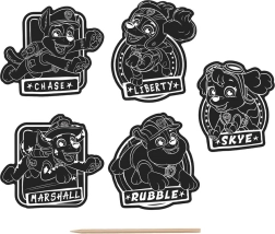 Открий креативно забавление с любимите герои от ПЕС ПАТРУЛ. С помощта на шпатулката ще разкриеш цветни мотиви, скрити под черния слой, а готовите изображения лесно ще използваш като стикери за тетрадки, подаръци или картички. В комплекта има 5 бр. стикери.