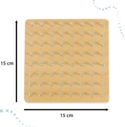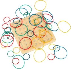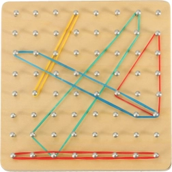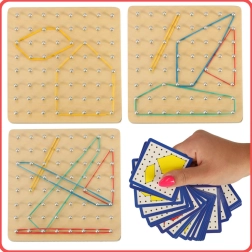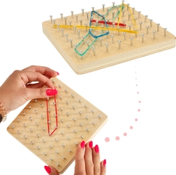 Открийте забавен начин да запознаете децата с основите на математиката – форми, ъгли и симетрия. На дървената дъска с гъста решетка от колчета децата опъват ластици с различна дължина и цветове и създават фигури по картите или по собствена фантазия. Играта укрепва координацията око–ръка, концентрацията и логическото мислене.