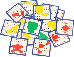 Двустранните карти с модели с различна трудност учат децата да разпознават форми, цветове, симетрия и ъгли. Нужно е само да опънат правилните ластици и да копират шаблона.