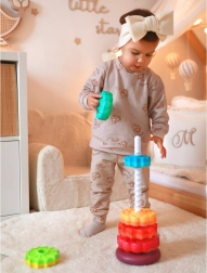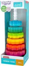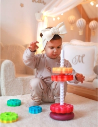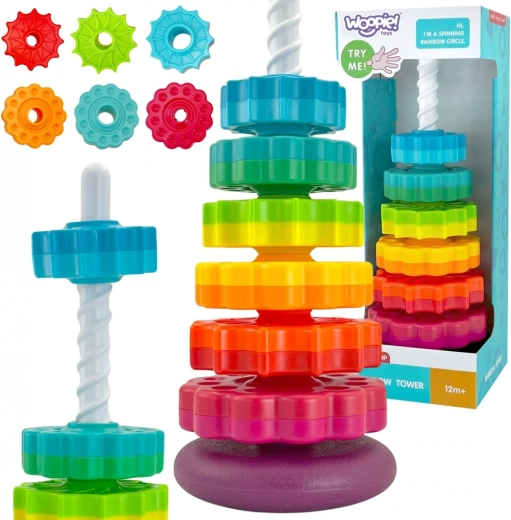Извита кула от марката Woopie е уникална играчка за деца, която ги въвежда в света на завладяващите цветове, форми и движение. Съдържа цветни елементи, които се поставят на прът чрез завинтване. Тази пирамида не само забавлява, но и образова, като подпомага цялостното развитие на детето. Благодарение на здравата изработка от безопасни материали, извитата кула осигурява издръжлива и безопасна играчка