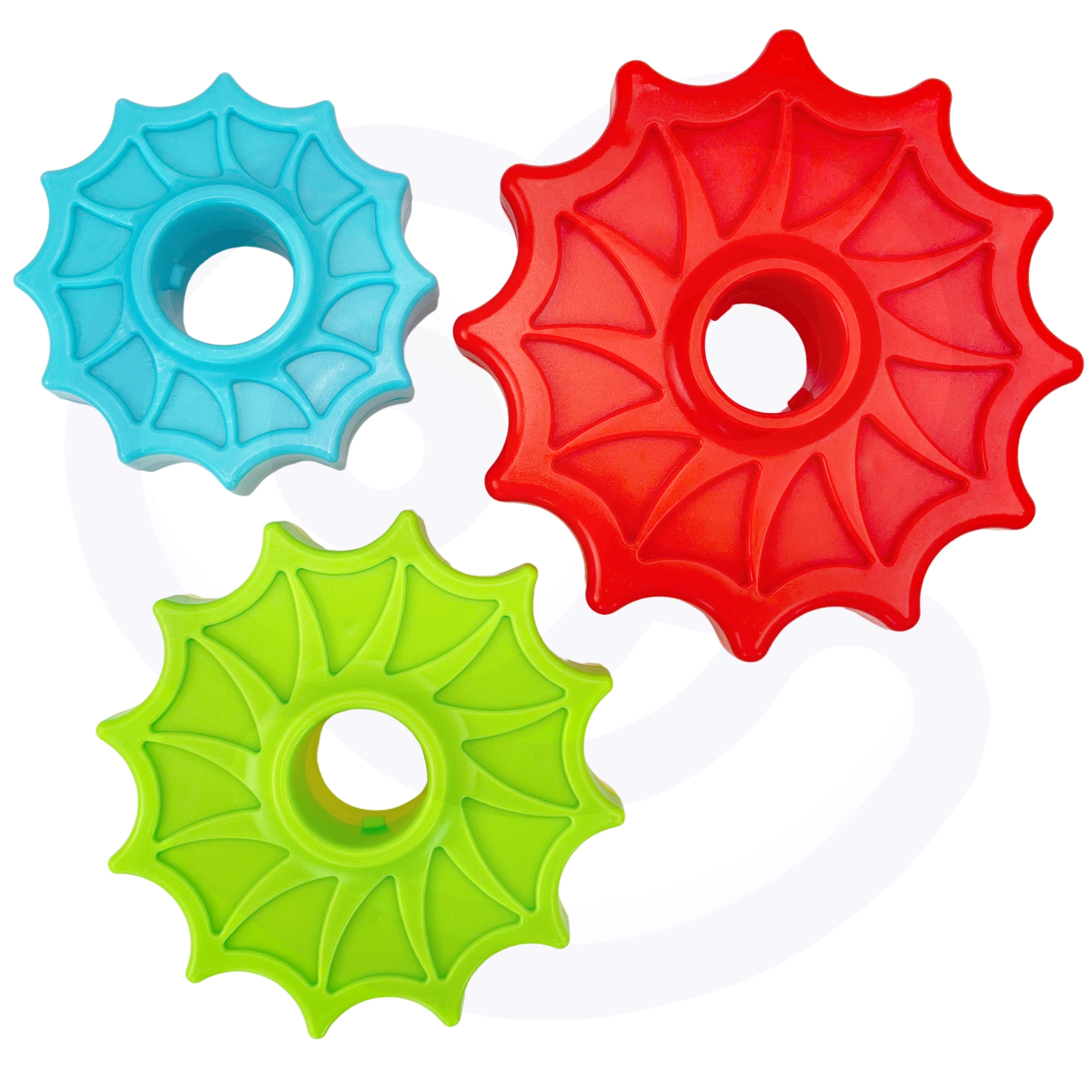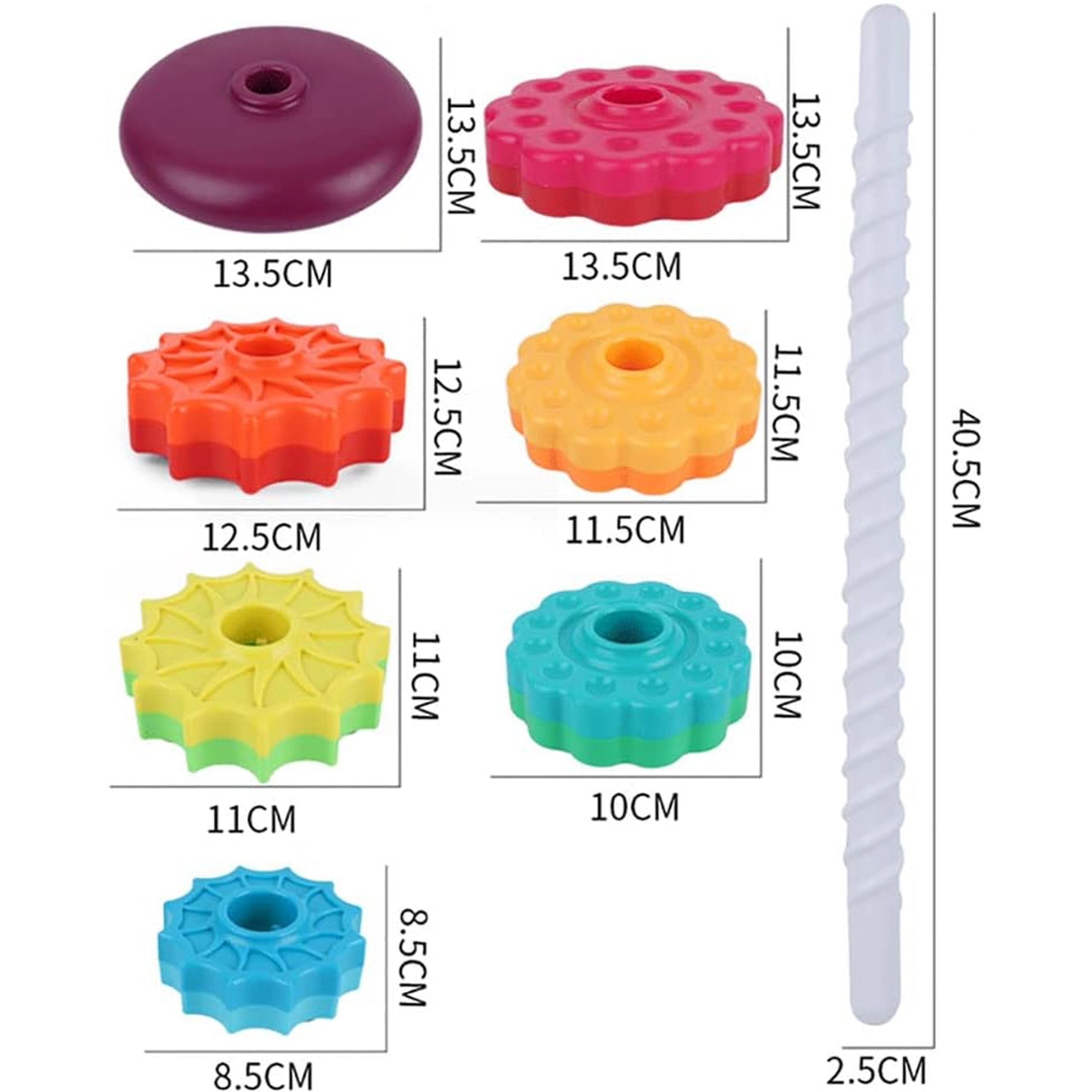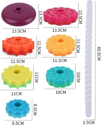 - Комплектът съдържа шест звездовидни диска, които могат да се подреждат един към друг и да създават цветна и въртяща се пирамида
