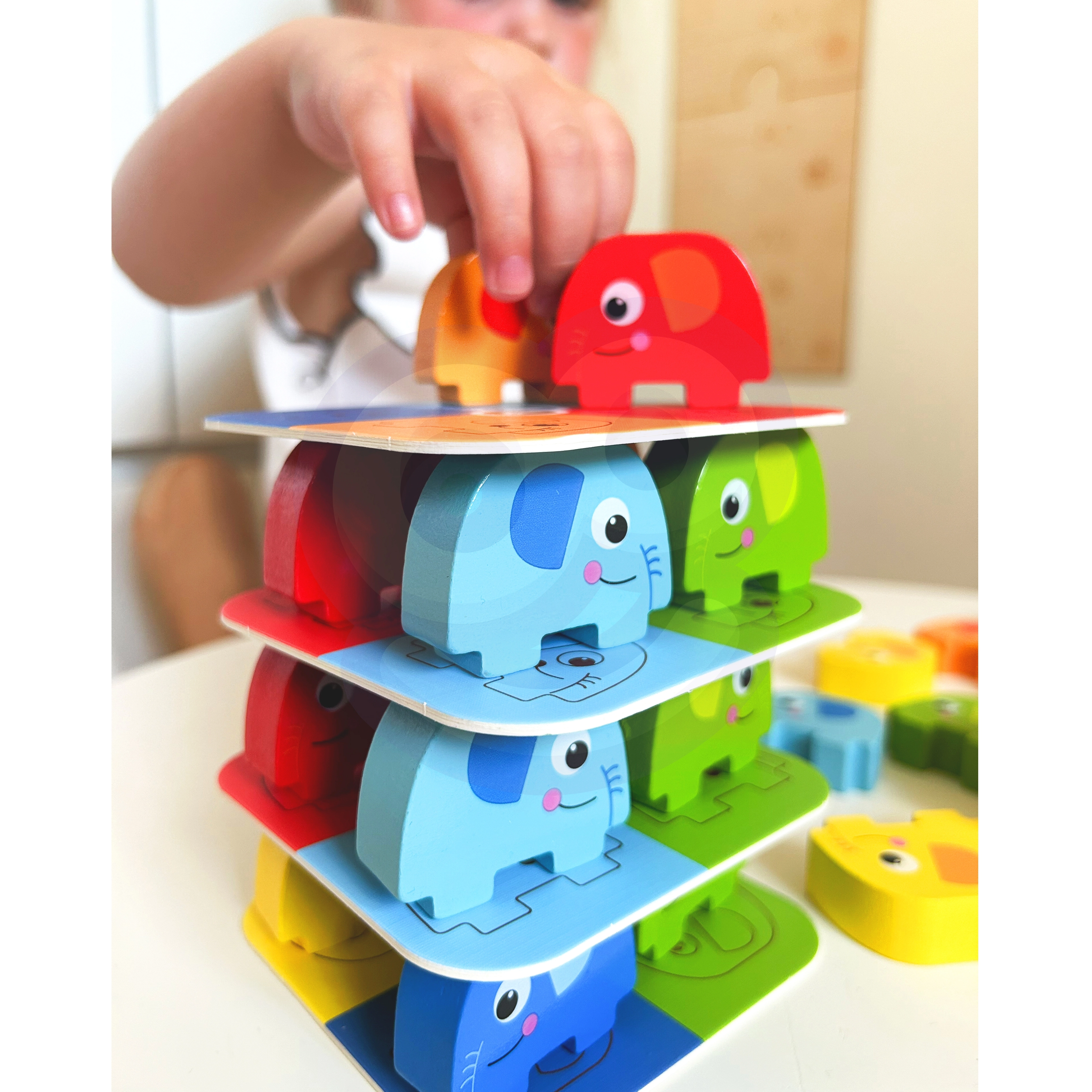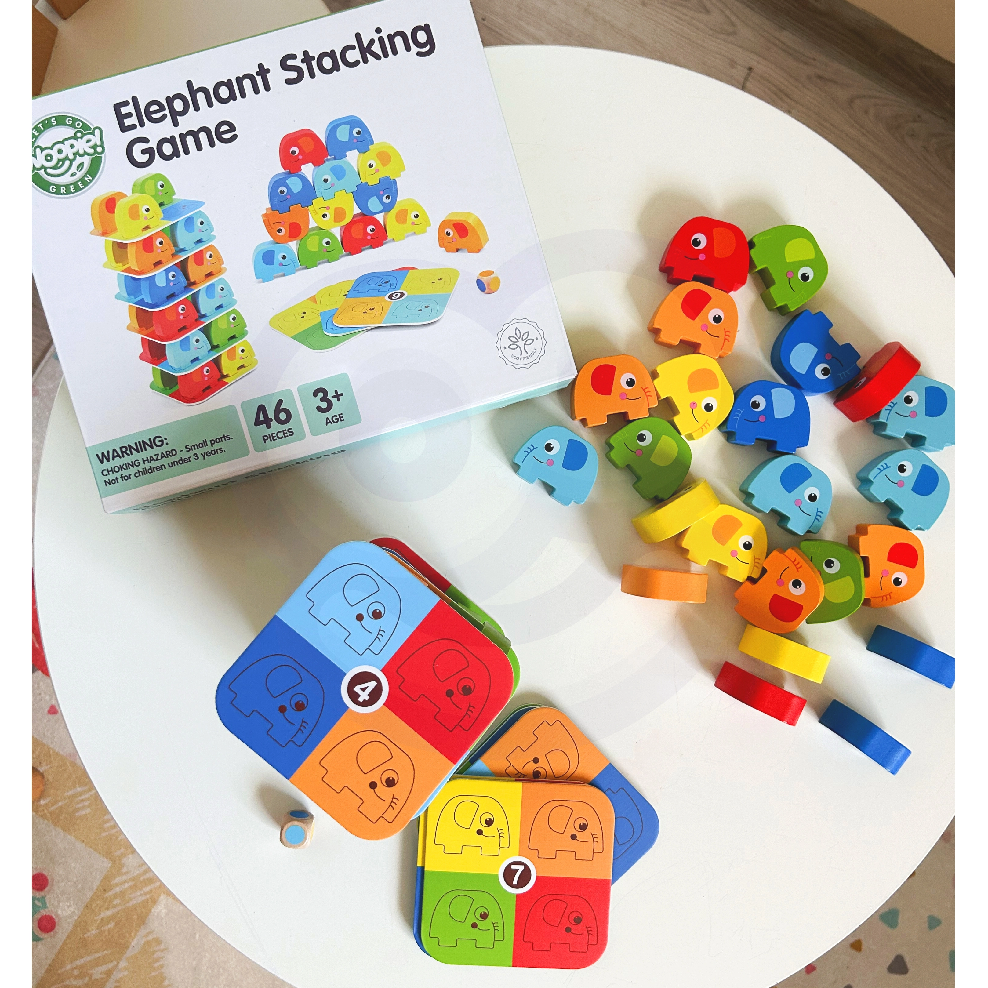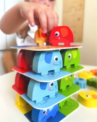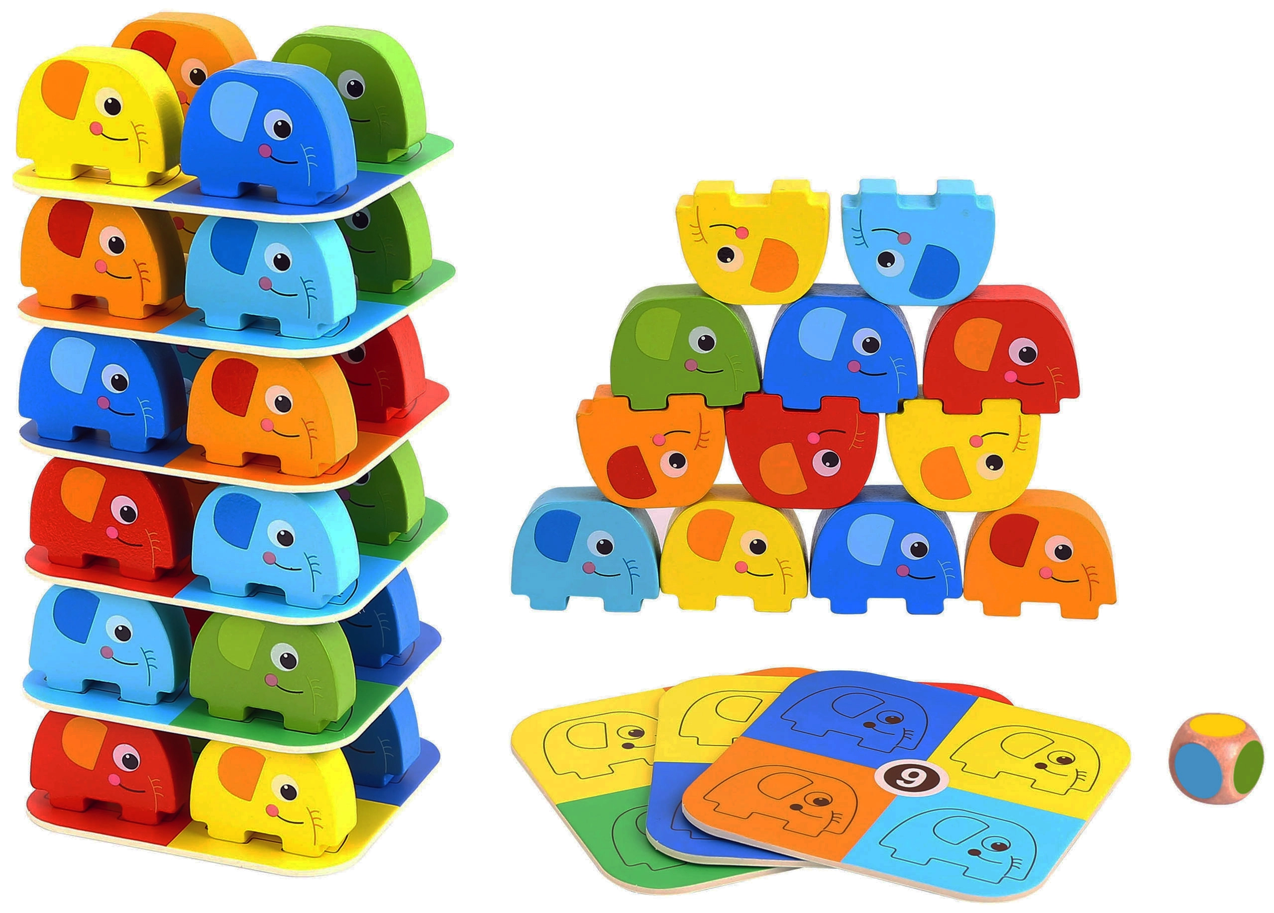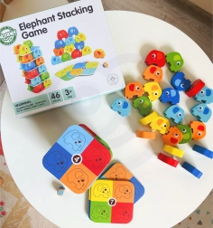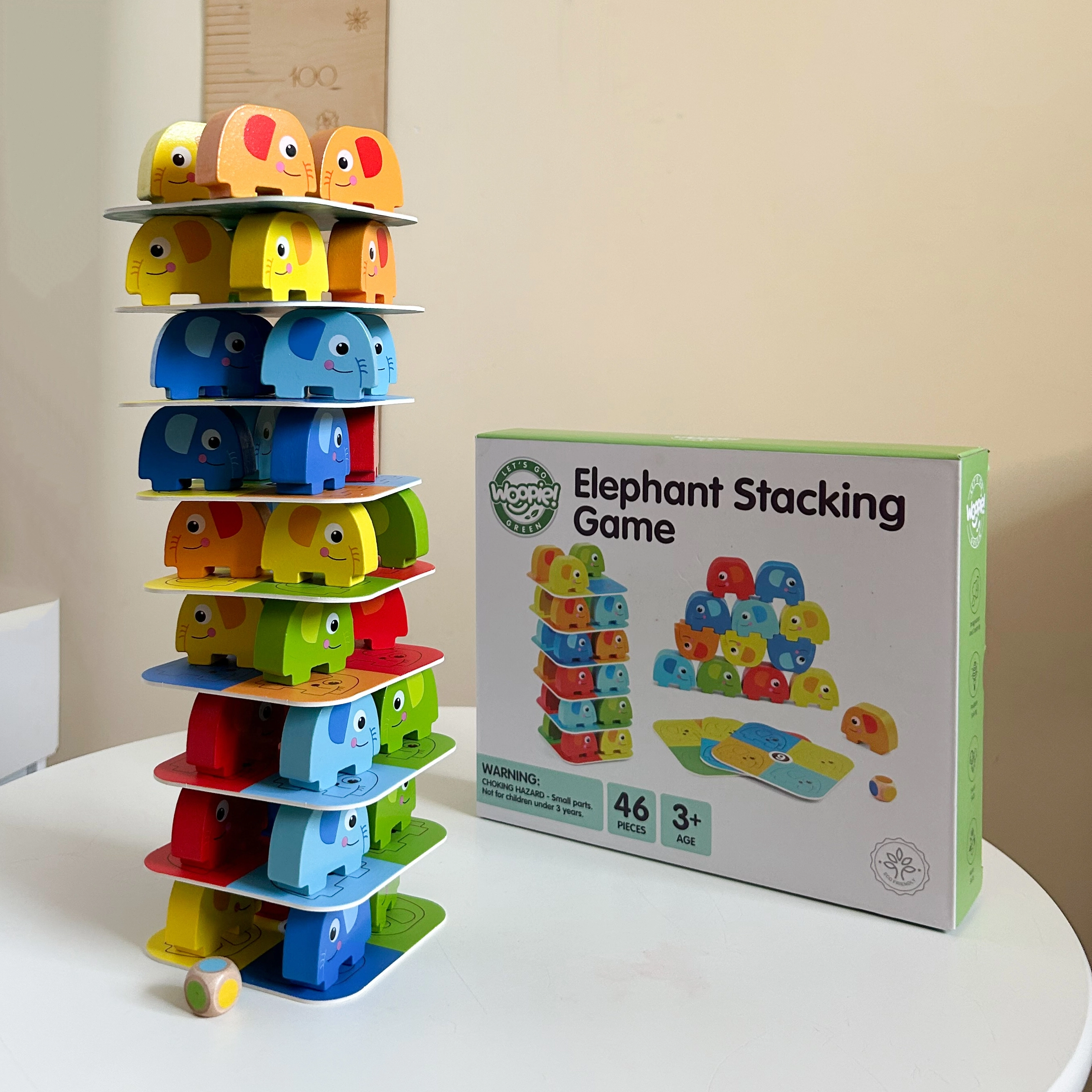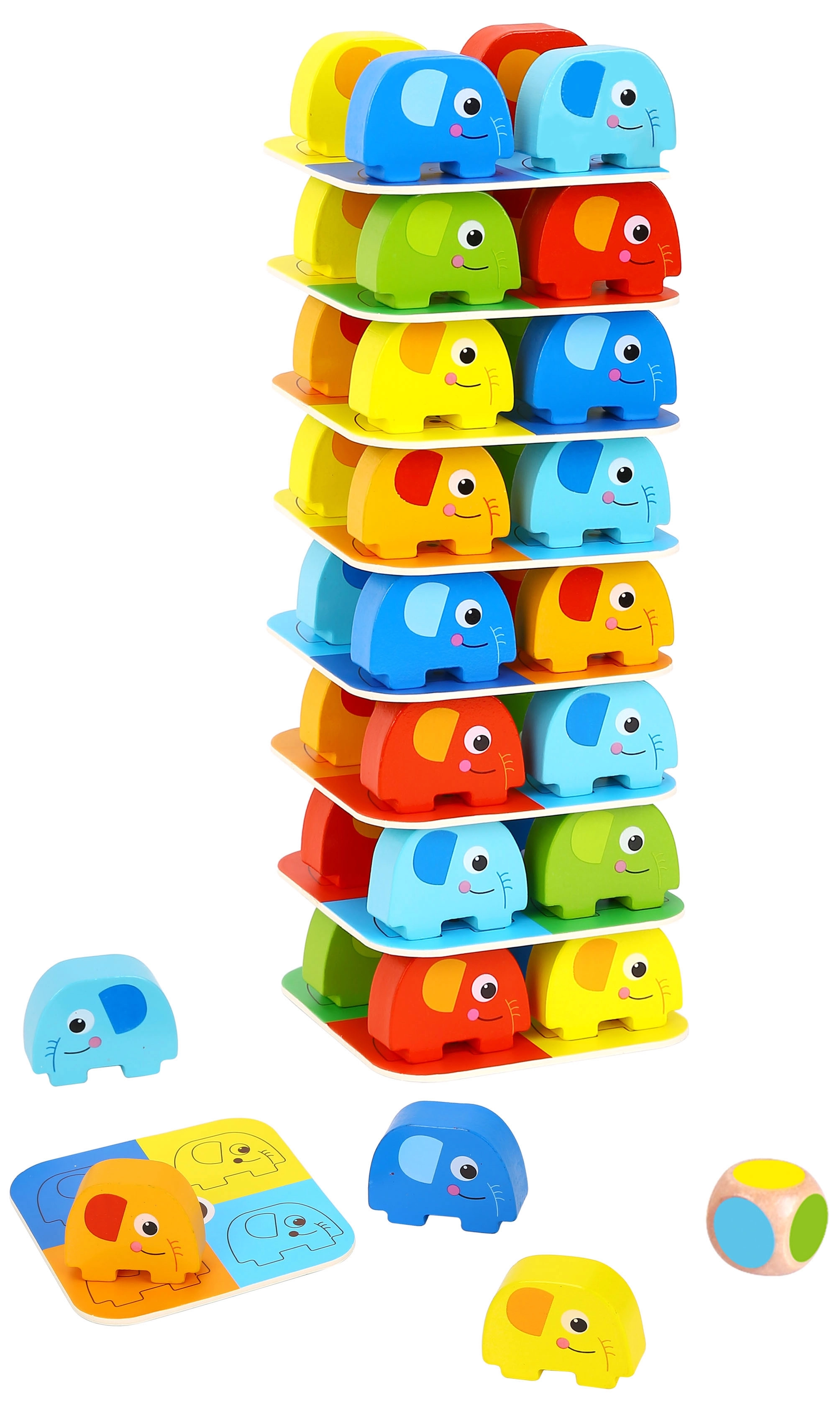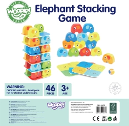 Изживейте забавление и приключение с играта Слон на слонове от Woopie. Тази игра включва 46 части, включително цветни блокчета и игрални карти. Идеална е за общо прекарване на време със семейството. Живите цветове и сладките форми привличат вниманието и предлагат две завладяващи възможности за игра – като игра за подреждане или като алтернатива на Jenga.