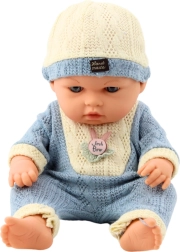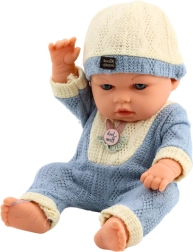 Куклата е с размери приблизително 29 x 15 cm, което я прави достатъчно голяма, за да впечатлява, но същевременно лека и лесна за управление – идеално пасва на малки ръчички и лесно се побира в повечето детски колички или легълца. Облечена е в мек плетен комплект в нюанси на светъл крем и пастелно синьо, украсен с нашивка.