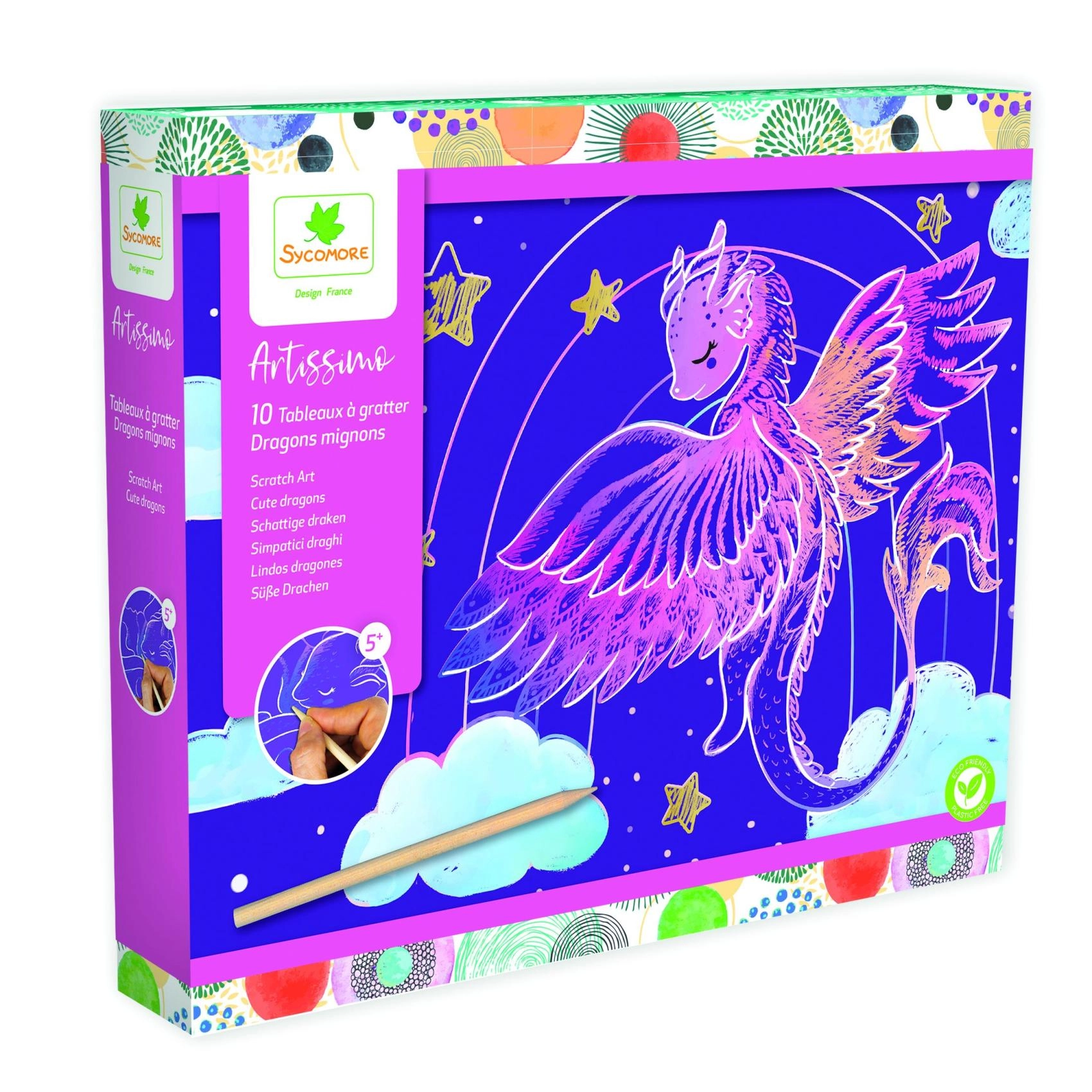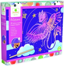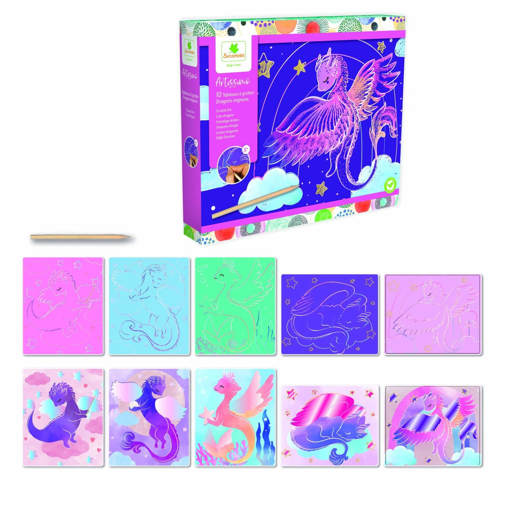 Креативен комплект за деца от 5 години с мотиви на сладки дракончета, който предлага часове творчество и радост. Съдържа 10 картинки, дървено стъргалце и инструкция. Лесни стъпки, красиви цветни мотиви и развитие на фината моторика го правят идеален подарък за малките творци.