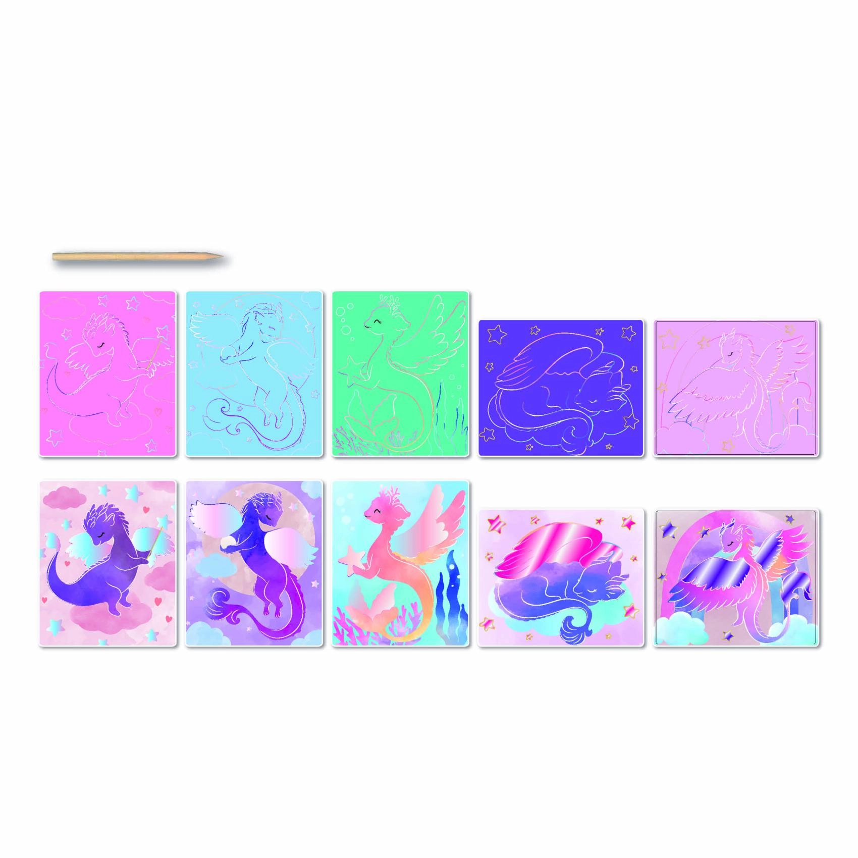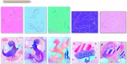 Открийте магичния свят на фантазията с изстъргващия комплект ДРАКОНЧЕТА. Нужно е търпеливо да изстъргвате черната повърхност и под нея постепенно се разкриват цветни и детайлни изображения. Комплектът е идеален за деца от 5 години – творенето е безопасно, лесно и носи красив резултат.