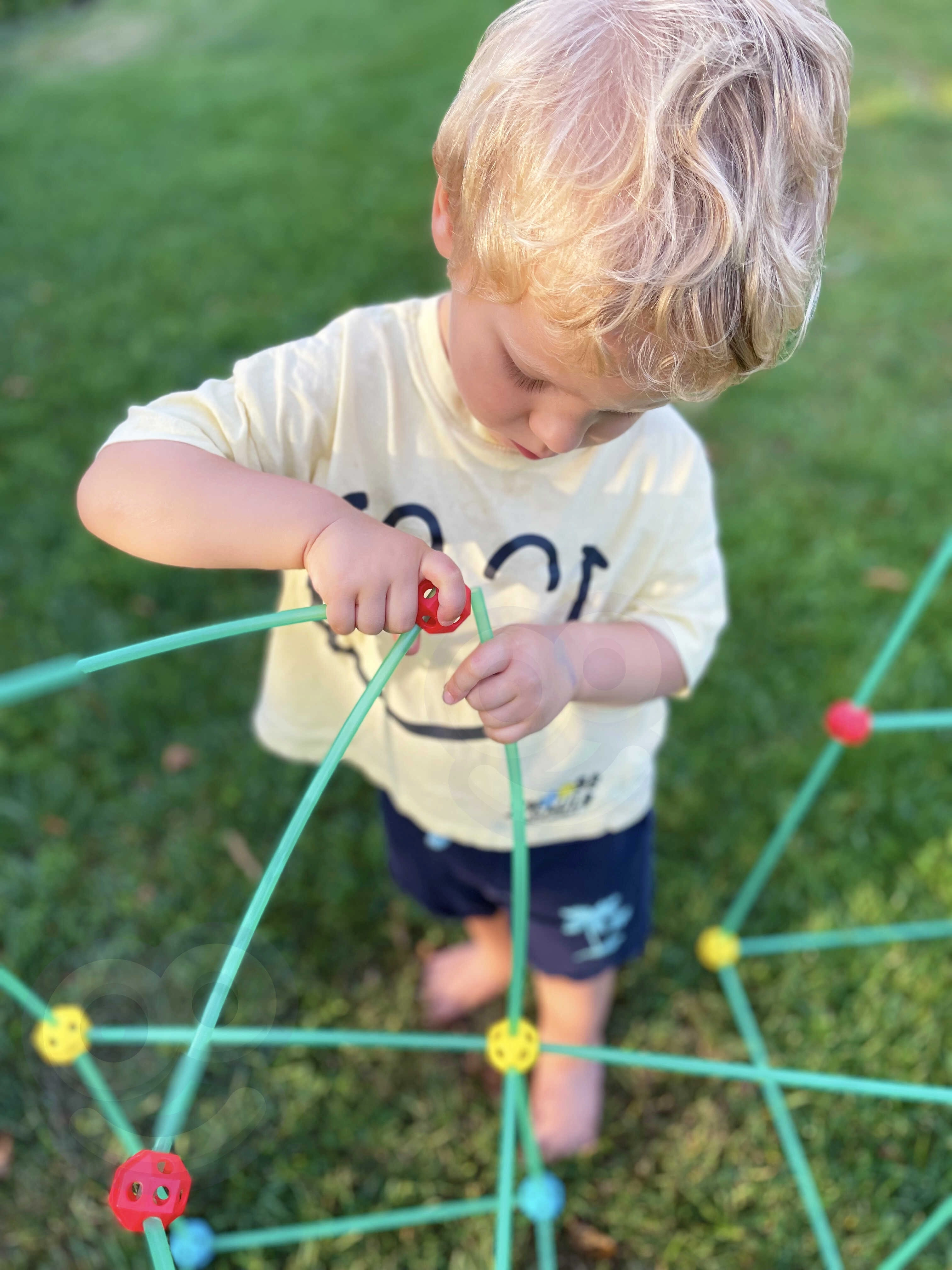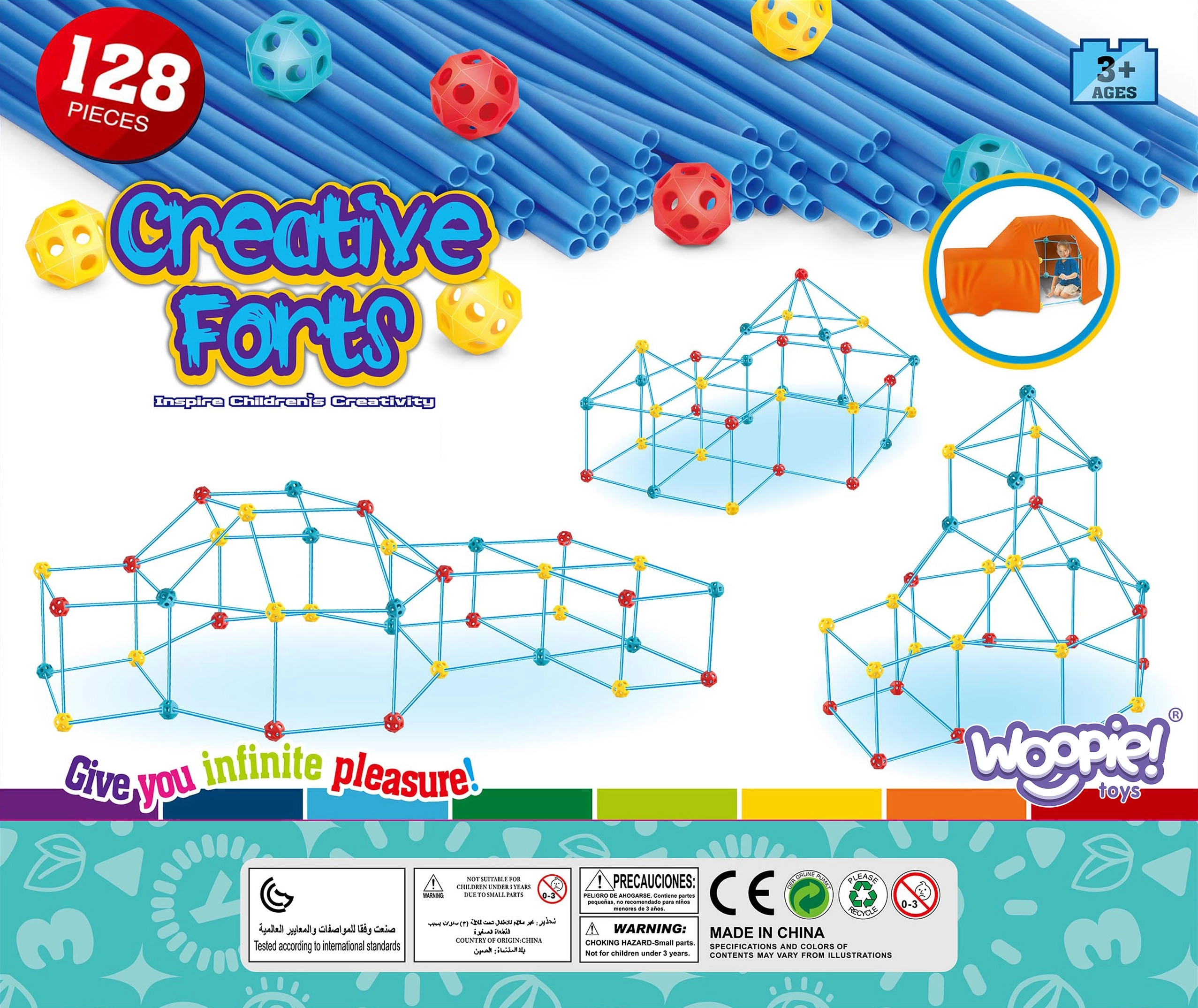 Конструкционният комплект на марката WOOPIE ще събуди у вашето дете истински строител! Комплектът съдържа 128 елемента, включително сламки, свързващи тръбички и материал за покриване на конструкцията. Позволява създаване на пространствени постройки, например палатка, която можете да покриете с плат. Идеален за креативно забавление както у дома, така и на открито.