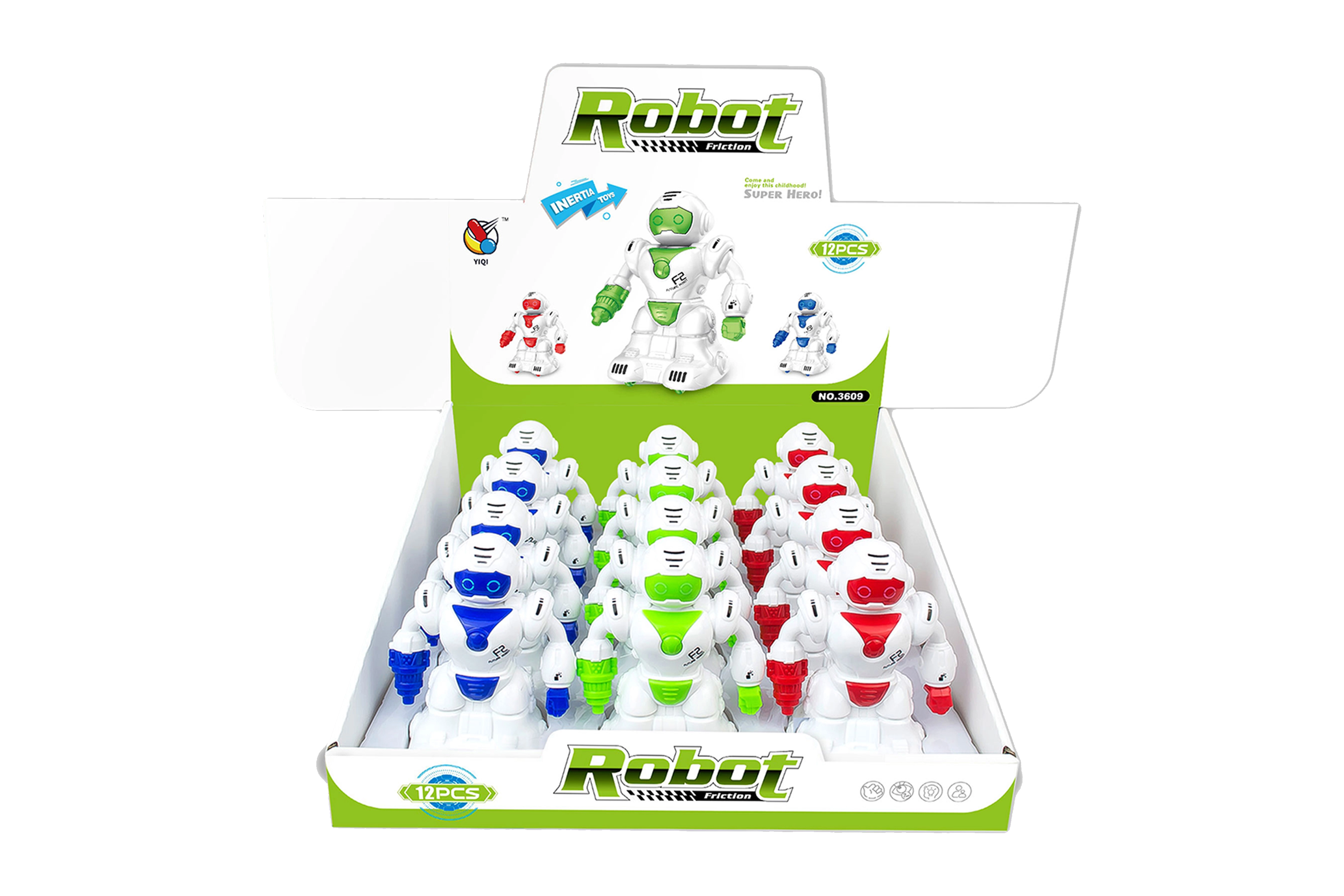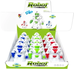 Открийте забавлението с робот с инерционно задвижване с размер 12 см, наличен в три ярки цвята: зелено, синьо и червено.
