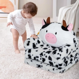 Очарователният дизайн с характерни бяло-черни петна, приятелско личице, розов нос, изпъкнали уши и меки рогца веднага привлича вниманието на децата и внася в интериора весела и уютна атмосфера. Кравешкият мотив перфектно се съчетава с декора на детската стая и се превръща във функционално допълнение към нея.