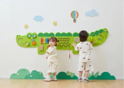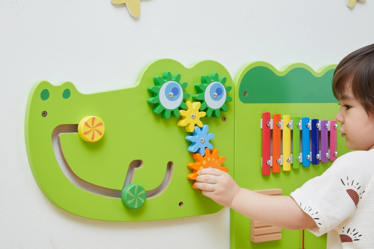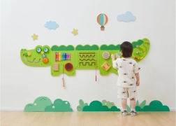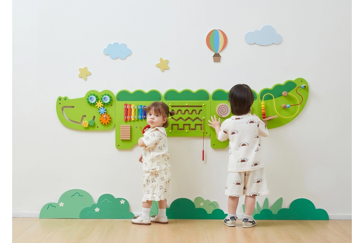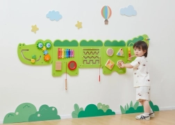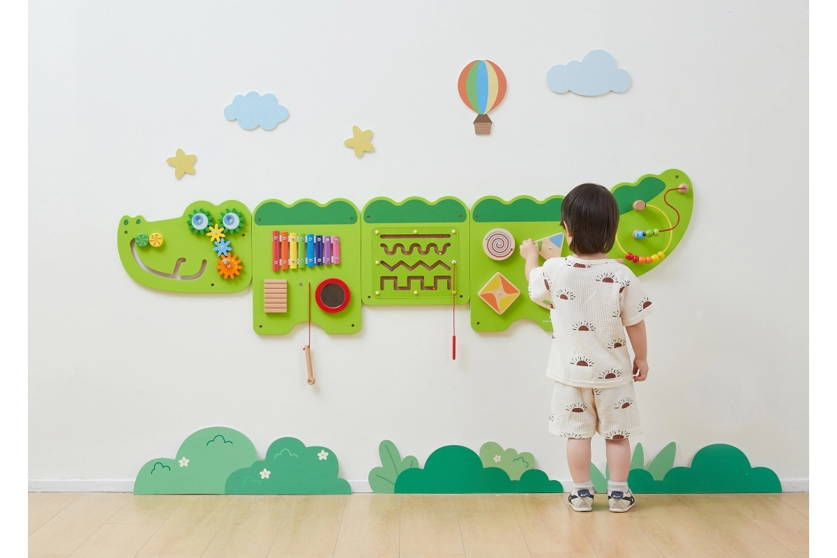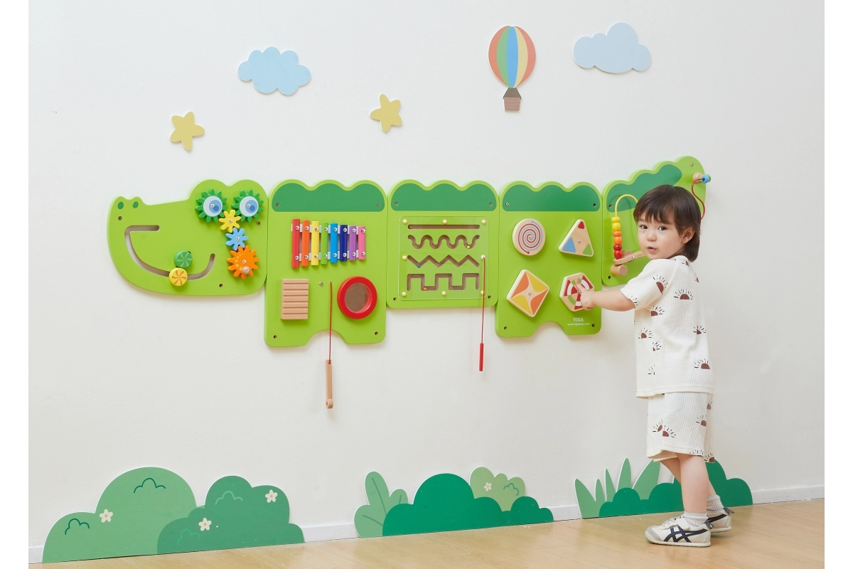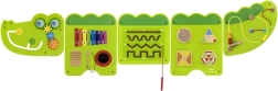 Тази голяма стенна активна дъска във вид на весел крокодил е разделена на няколко панела, които приканват децата към откривателство. Цветните елементи стимулират любопитството, развиват сетивата и насърчават самостоятелната игра. Здрава дървена конструкция с гладки ръбове е безопасна и устойчива за ежедневна употреба.