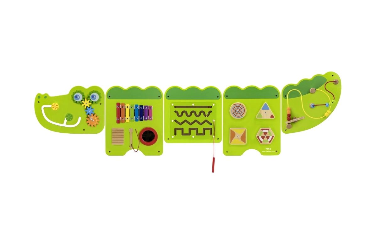 Забавна дървена стенна дъска във формата на крокодил носи на децата от 18 месеца часове сензорно откривателство и тренировка на фината моторика. Предлага ксилофон, зъбни колела, лабиринт, плъзгащи се и въртящи се елементи, както и мъниста на тел, които развиват координация око–ръка, логическо мислене и музикално възприятие. Благодарение на монтаж на стена пести пространство и е идеална за детски стаи, детски градини и игрални кътове.