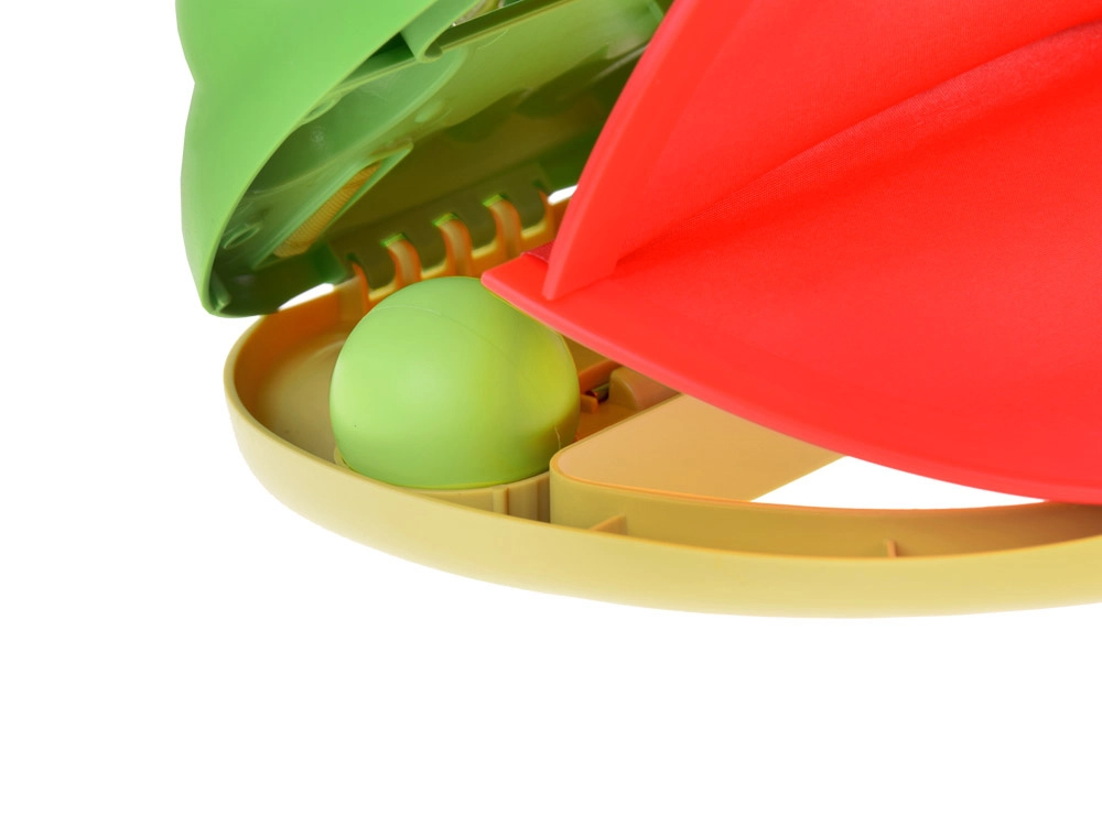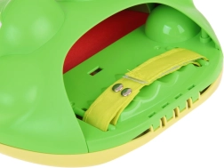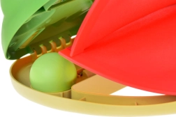 - Отстрани на катапулта има бял цип – плъзнете го, за да отворите устата на жабата и да поставите топчето.