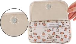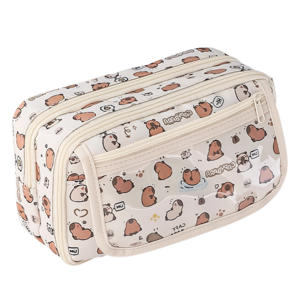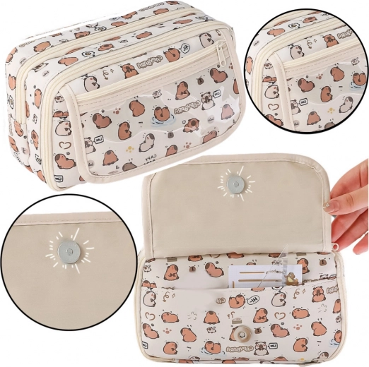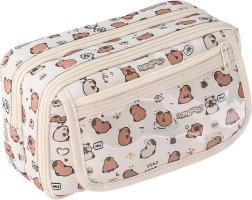 Големият и функционален несесер с мотив на капибари е идеален за ученици, които държат на практичността и очарователния външен вид. В кремав цвят с принт на симпатични капибари, несесерът изпъква сред останалите училищни пособия. Подходящ е за училище, университет, часове по изобразително изкуство или за домашния офис.