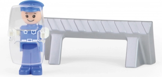 Включени са активна фигурка на полицай с щит и пътна бариера, които позволяват на децата да създават свои полицейски сценарии и да упражняват ролята „да помагам и да защитавам“. Играчката е изцяло механична – без батерии, само чисто забавление.