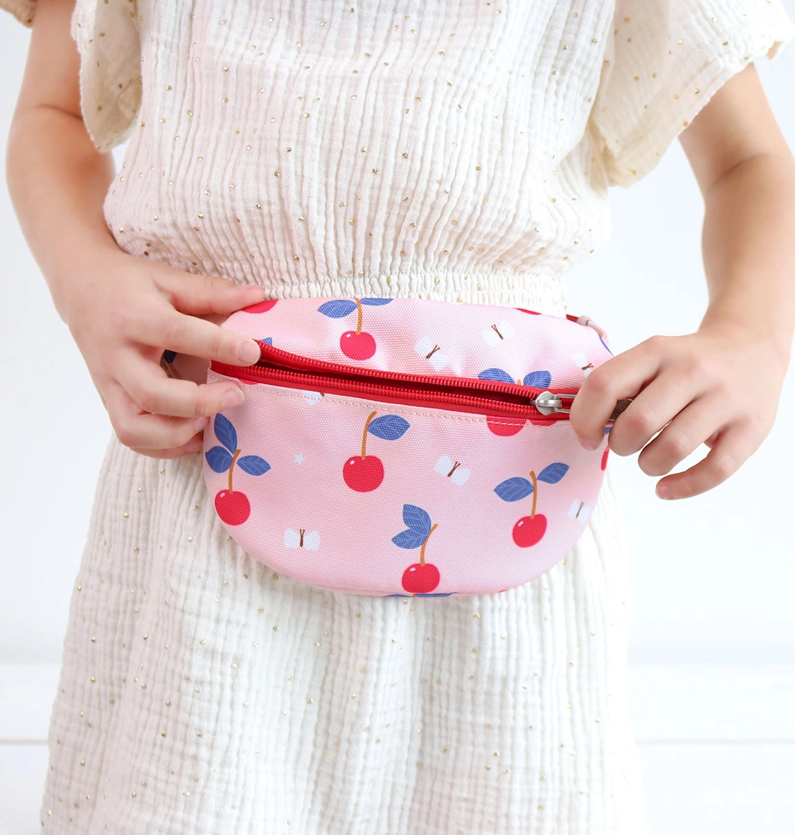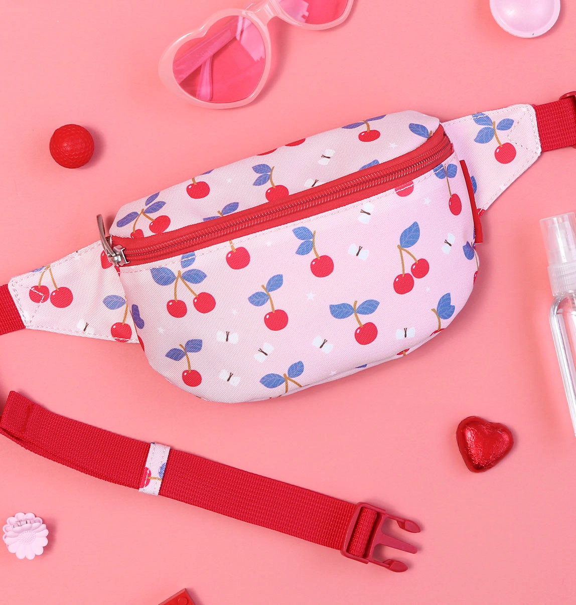 Поддържайте вашето мъниче стилно с тази очарователна чантичка. Детската розова чантичка за кръста с весел принт на череши не е само моден аксесоар, но и практичен помощник: