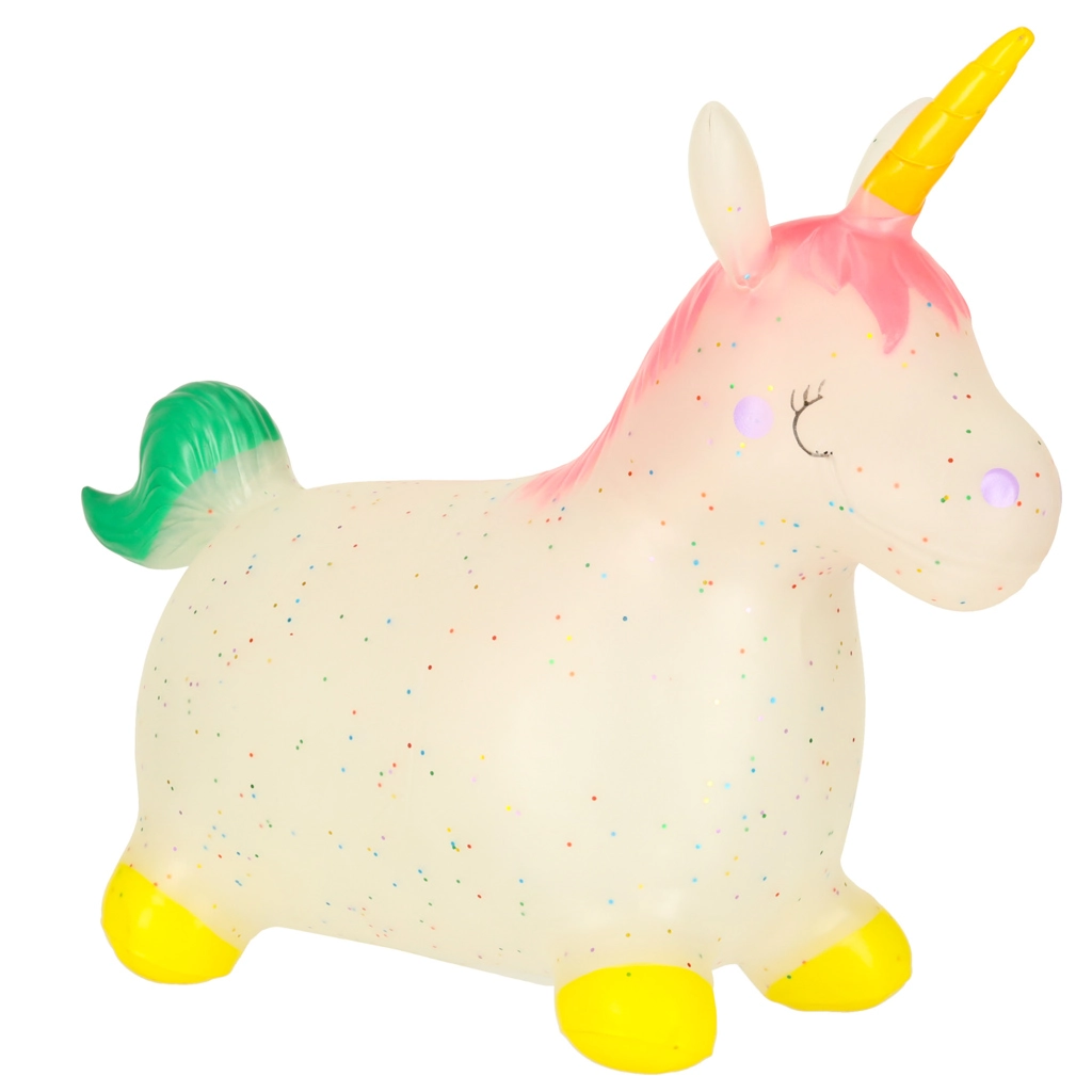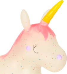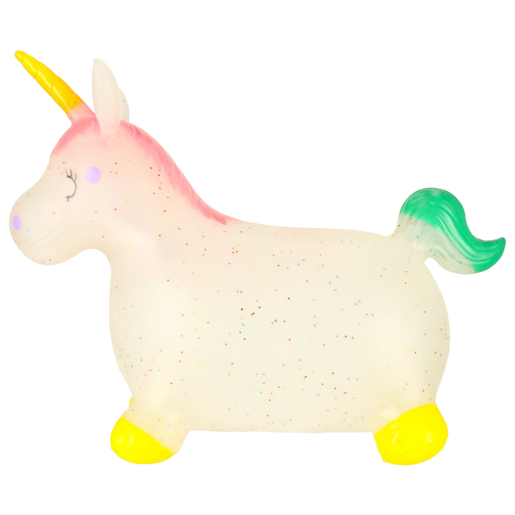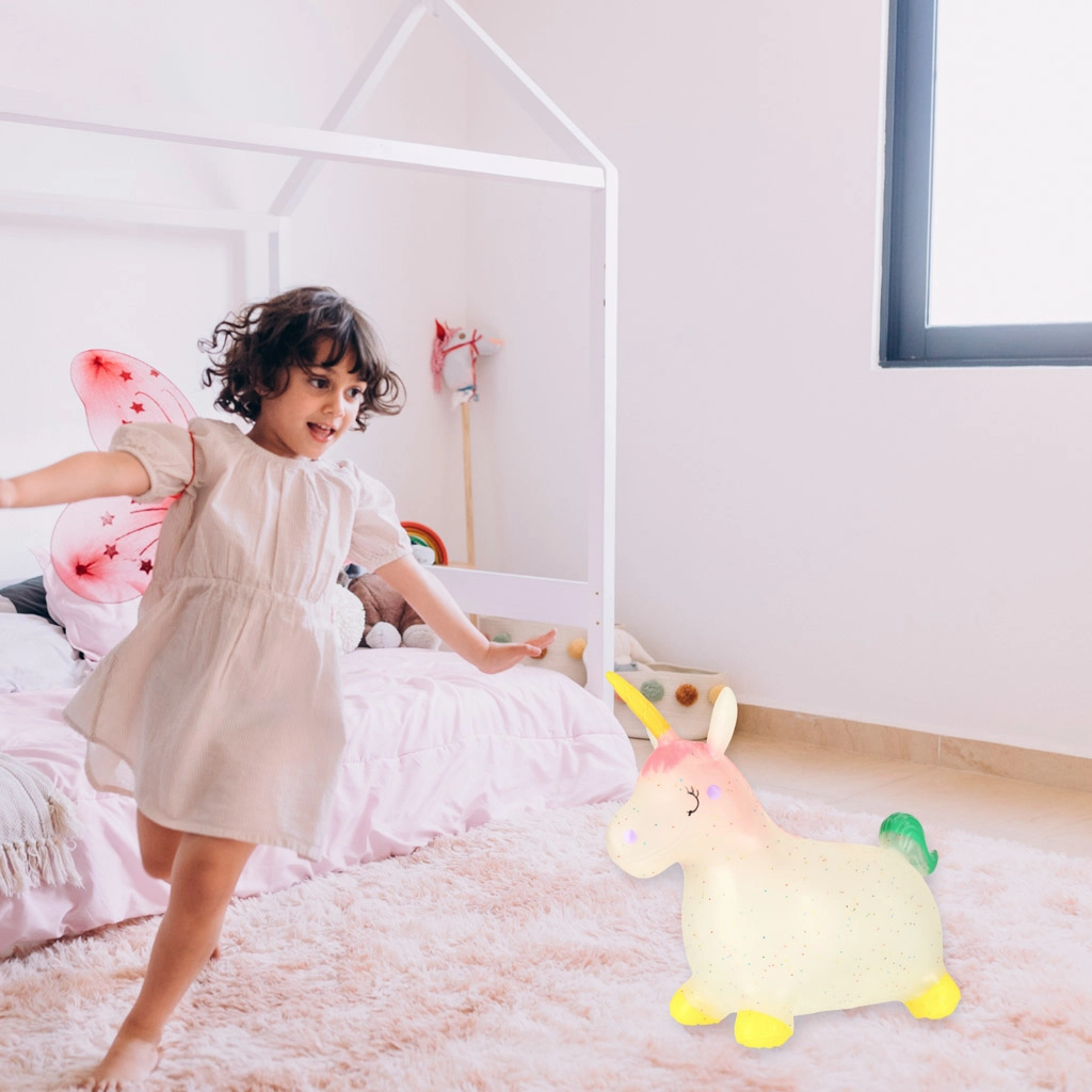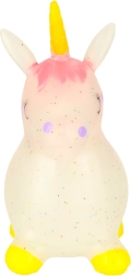 Изработен от еластична и издръжлива гума, скачащият еднорог е мек и гъвкав, с удостоверена безопасност.