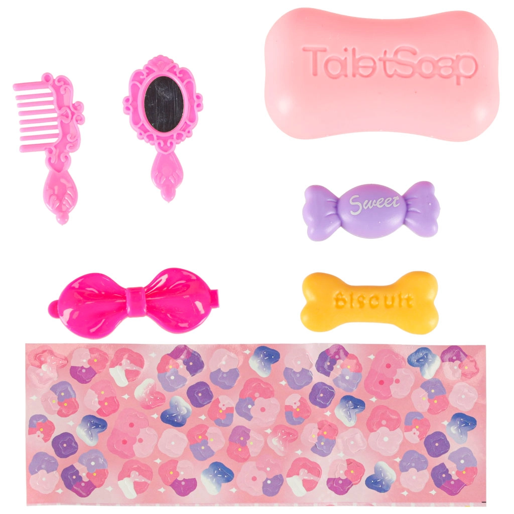 • Аксесоари: играчка-сапун, гребенче, огледалце, панделка-щипка, бонбон, бисквитка