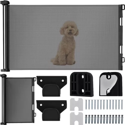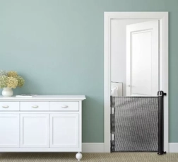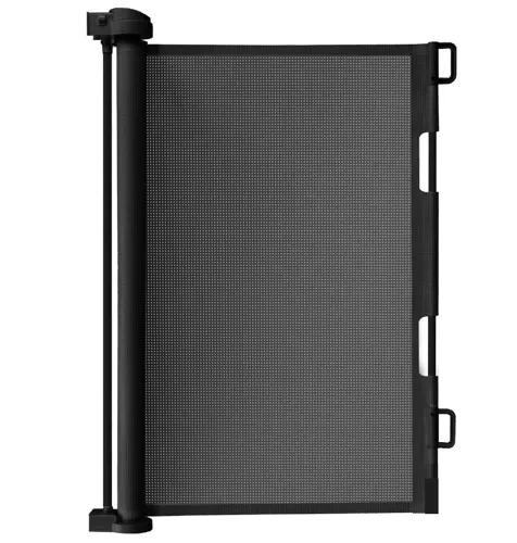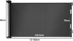 Практична изтегляща се предпазна бариера с мрежа, която пази децата и домашните любимци от опасни зони в дома. Лесна за управление, спестява място и благодарение на черния дизайн се вписва във всеки интериор. Разтяга се до 160 cm, височина 86 cm, издръжлива PVC мрежа и здрави метални и пластмасови компоненти осигуряват надеждна преграда при врати, в коридори и до стълбища.